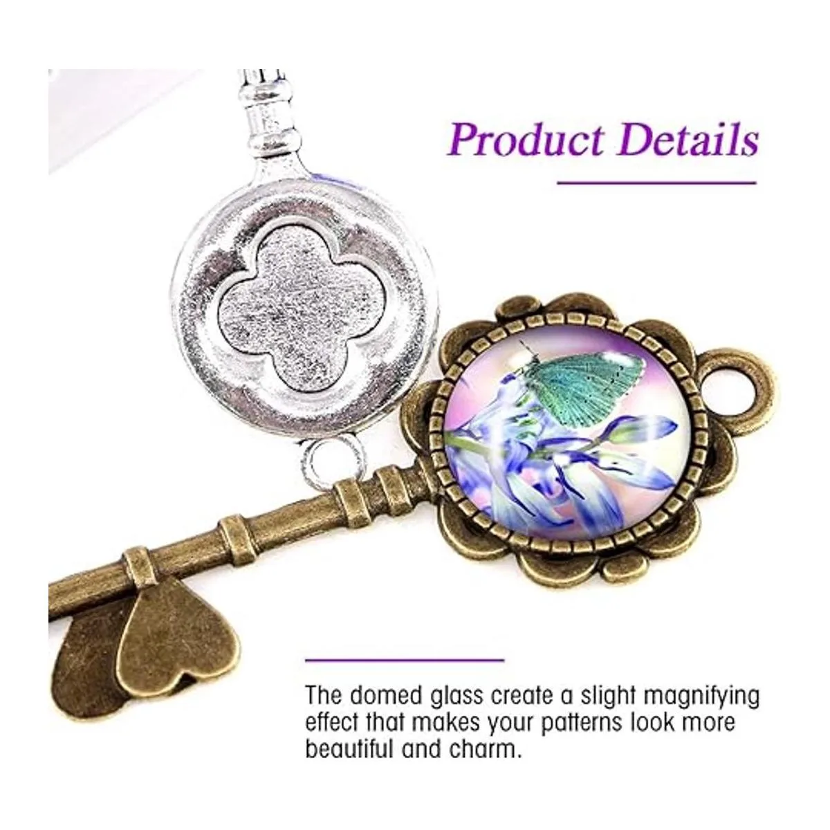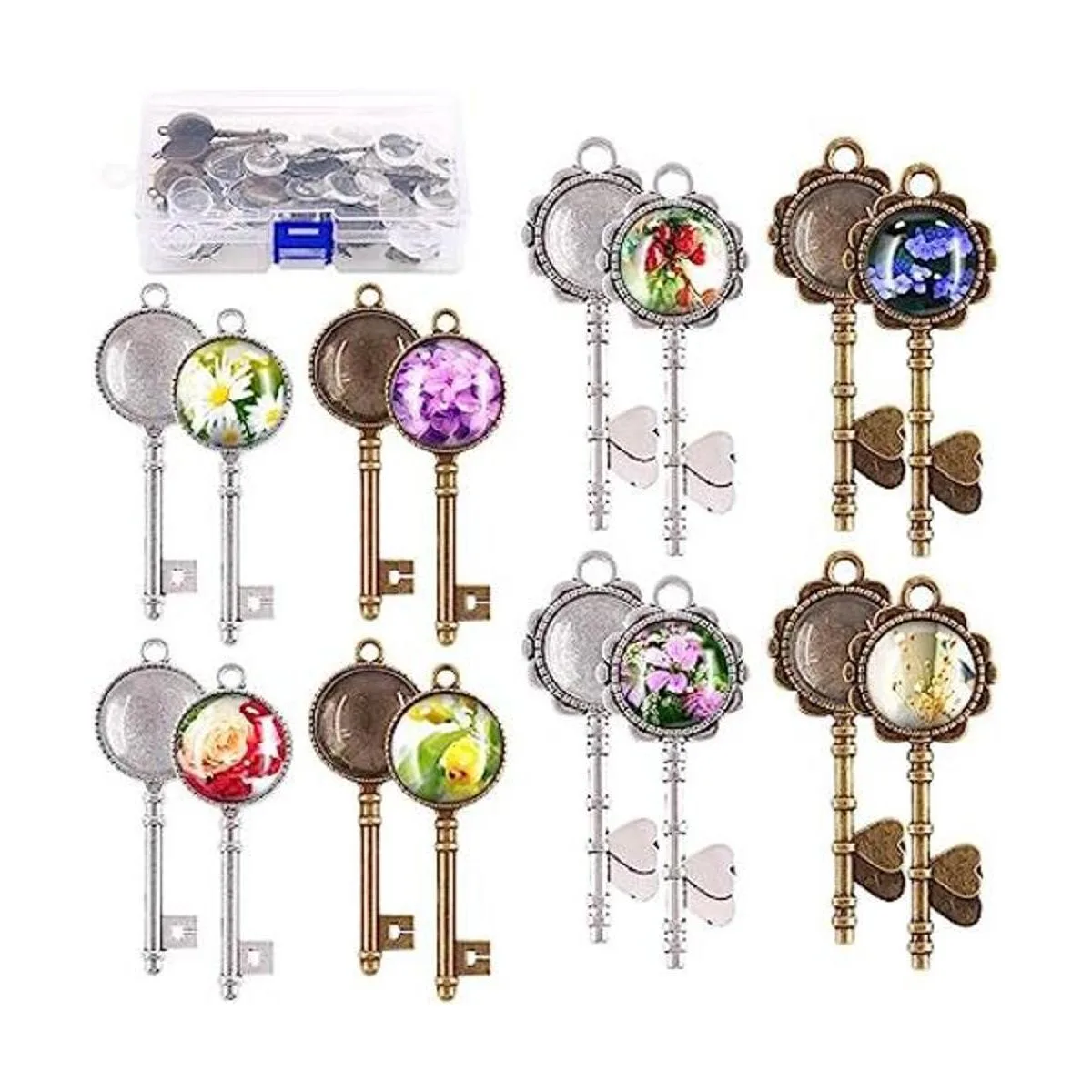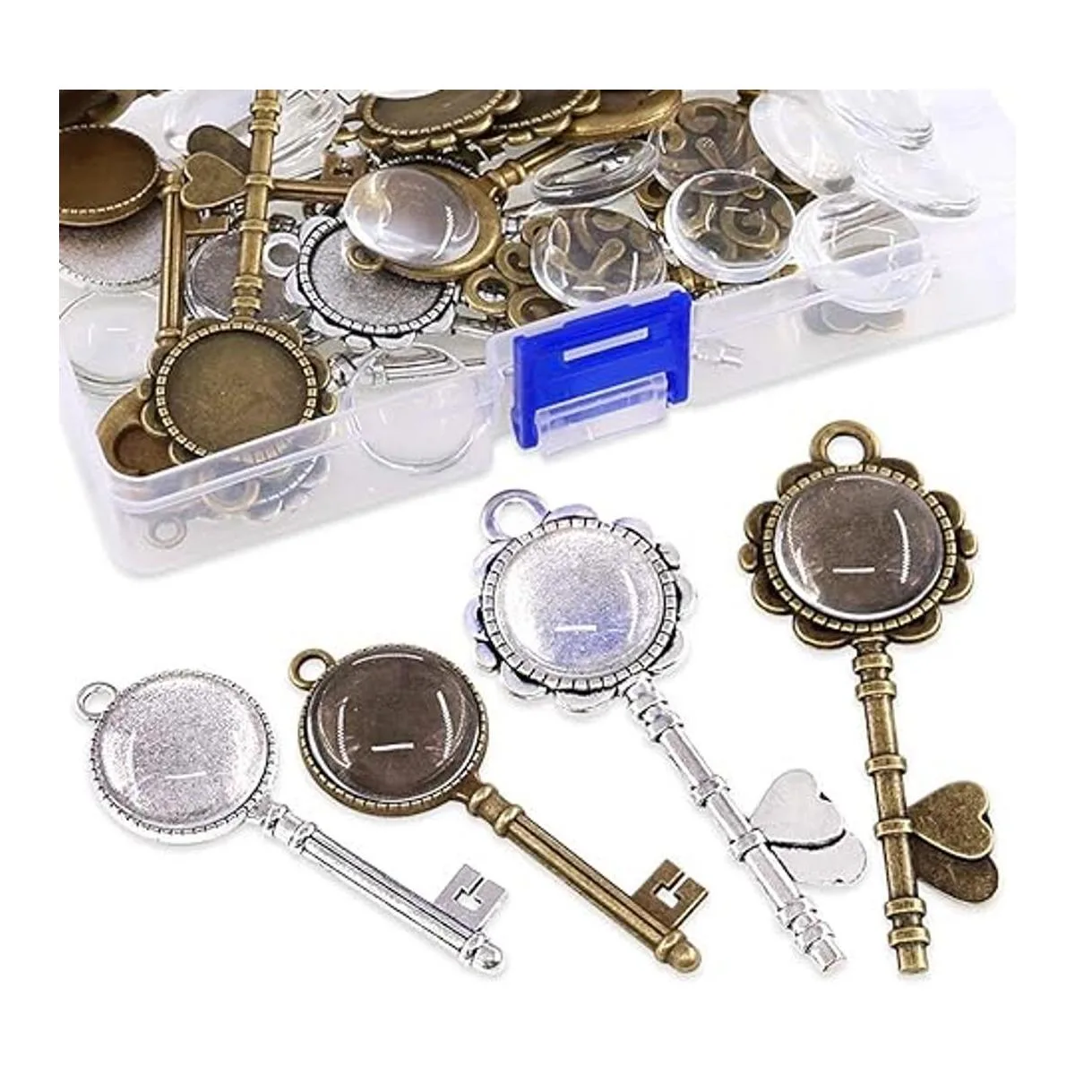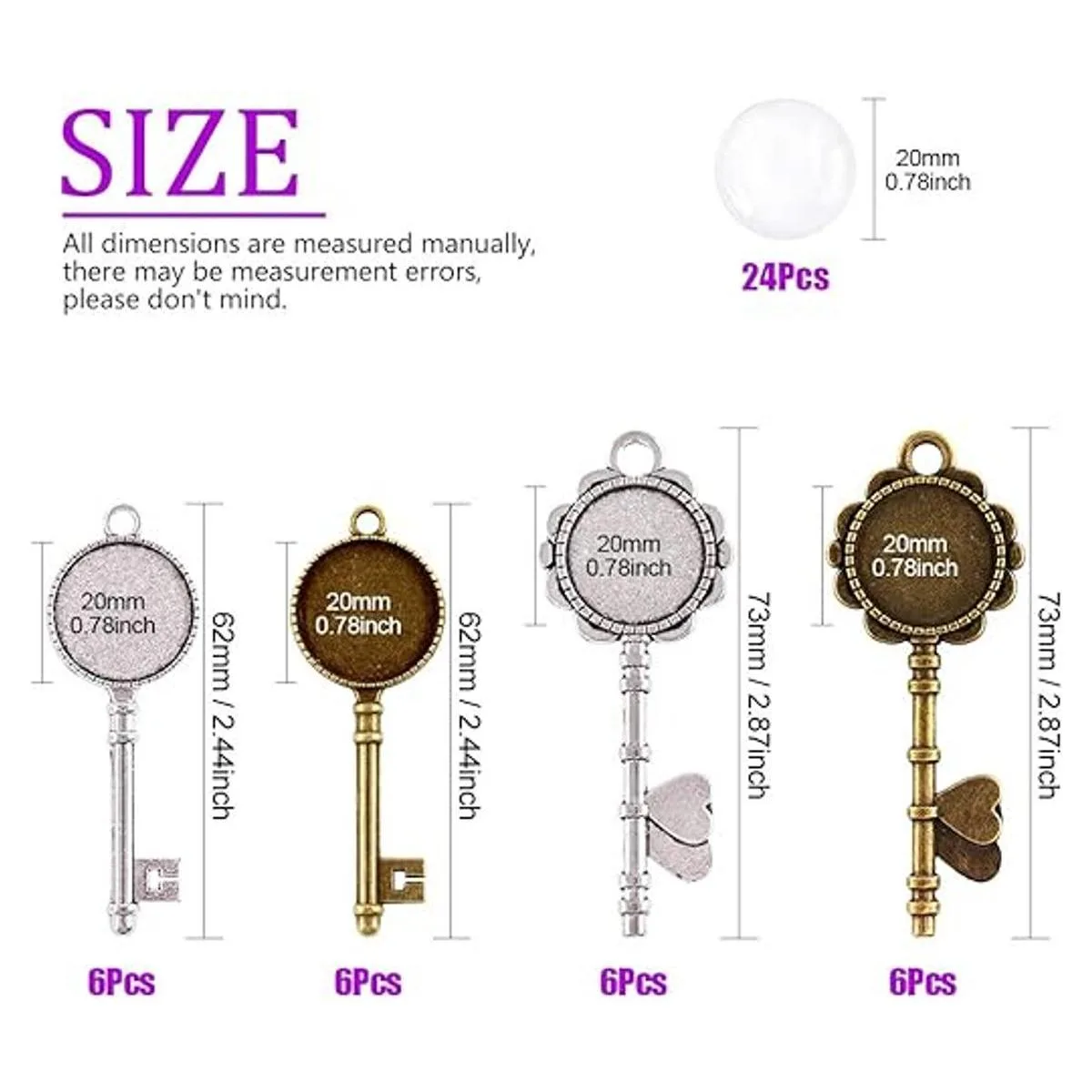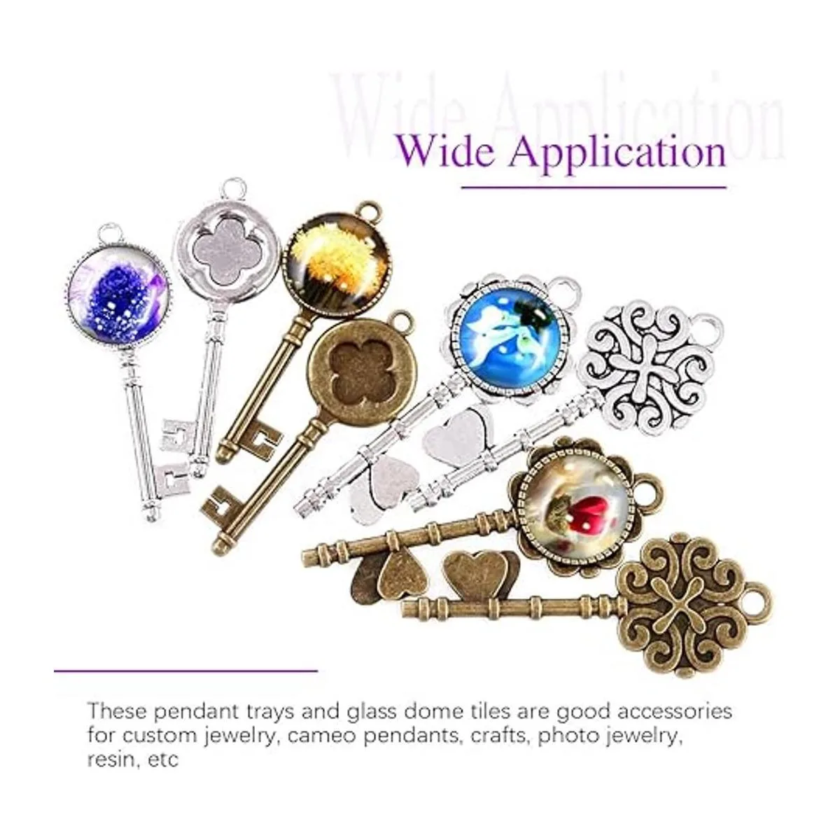 Swppet Juego de 48 piezas de 2 llaves con colgantes, 12 llaves de bronce vintage con forma de esqueleto y 12 llaves de plata, bandejas con 24 piezas de cristal, cúpula de azulejos, cabujón