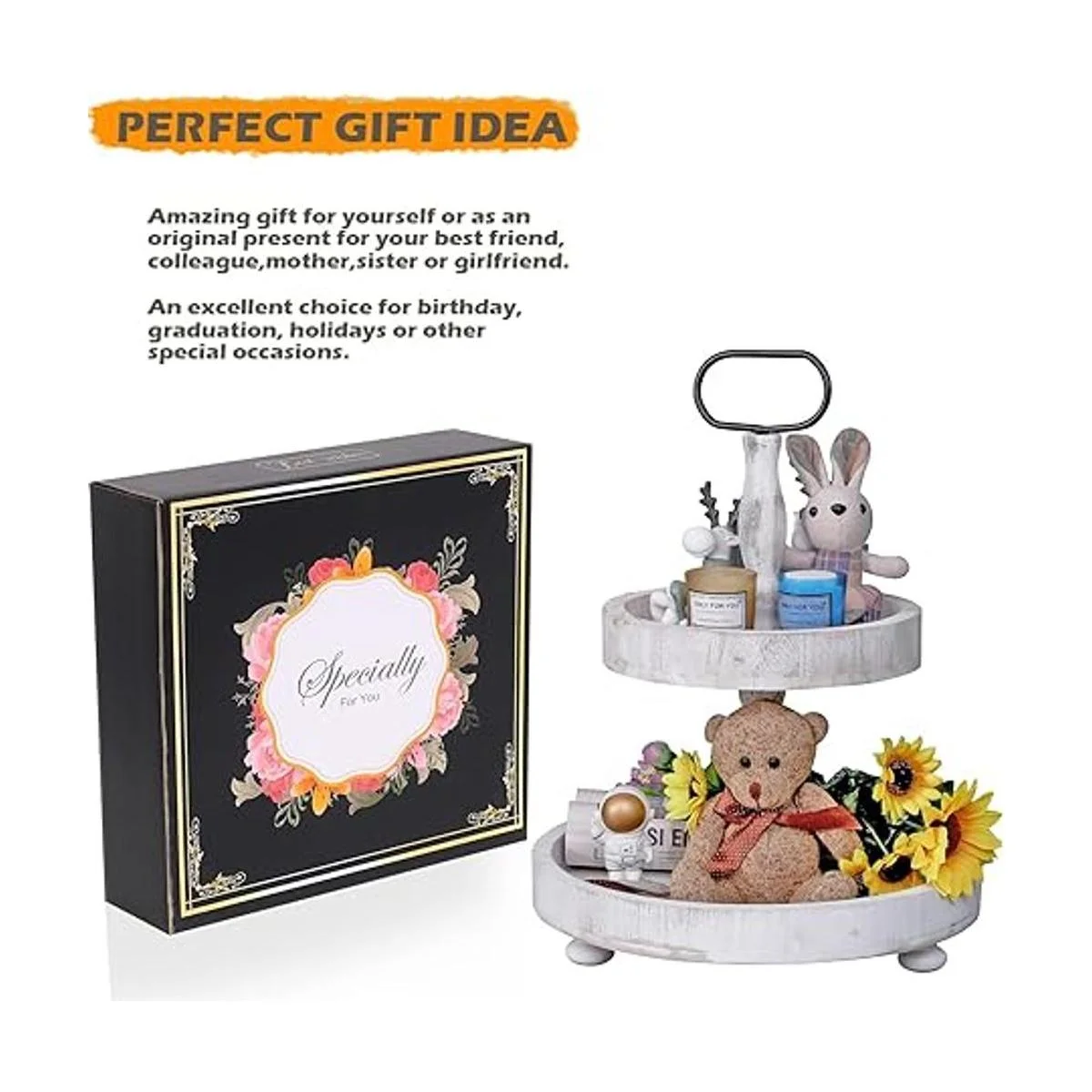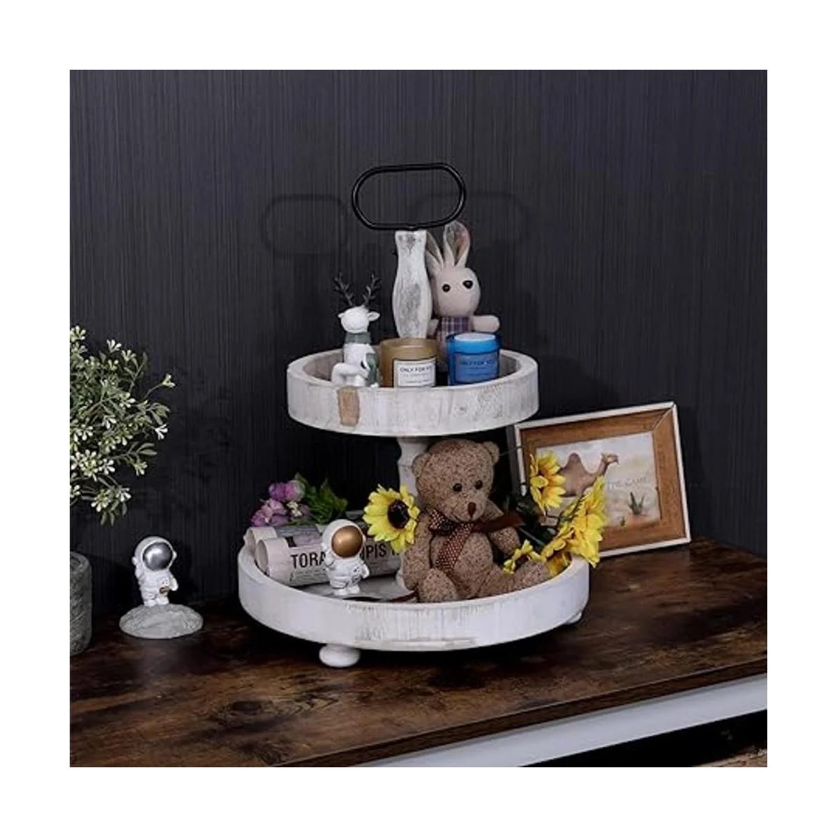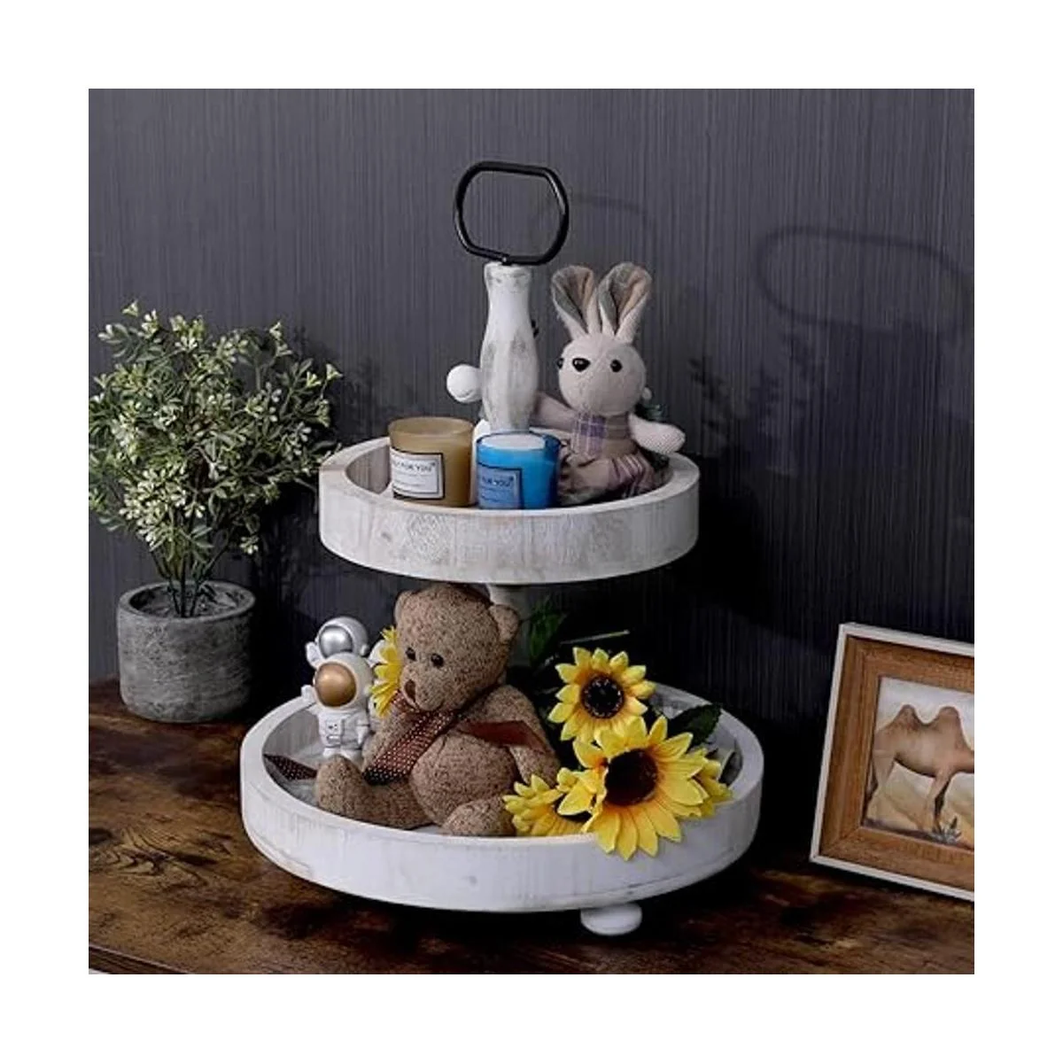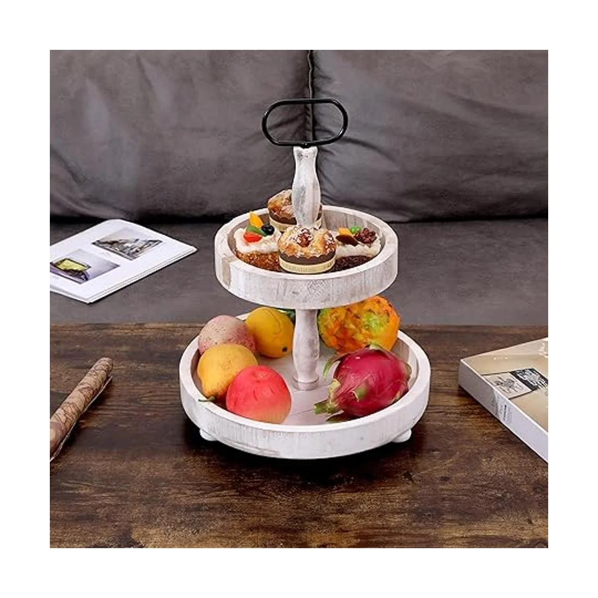 SWT8CAI Bandeja rústica de 2 niveles para pasteles, centro de mesa de decoración de cocina de granja, bandeja de 2 niveles para barra de café con mango y 1 posavasos
