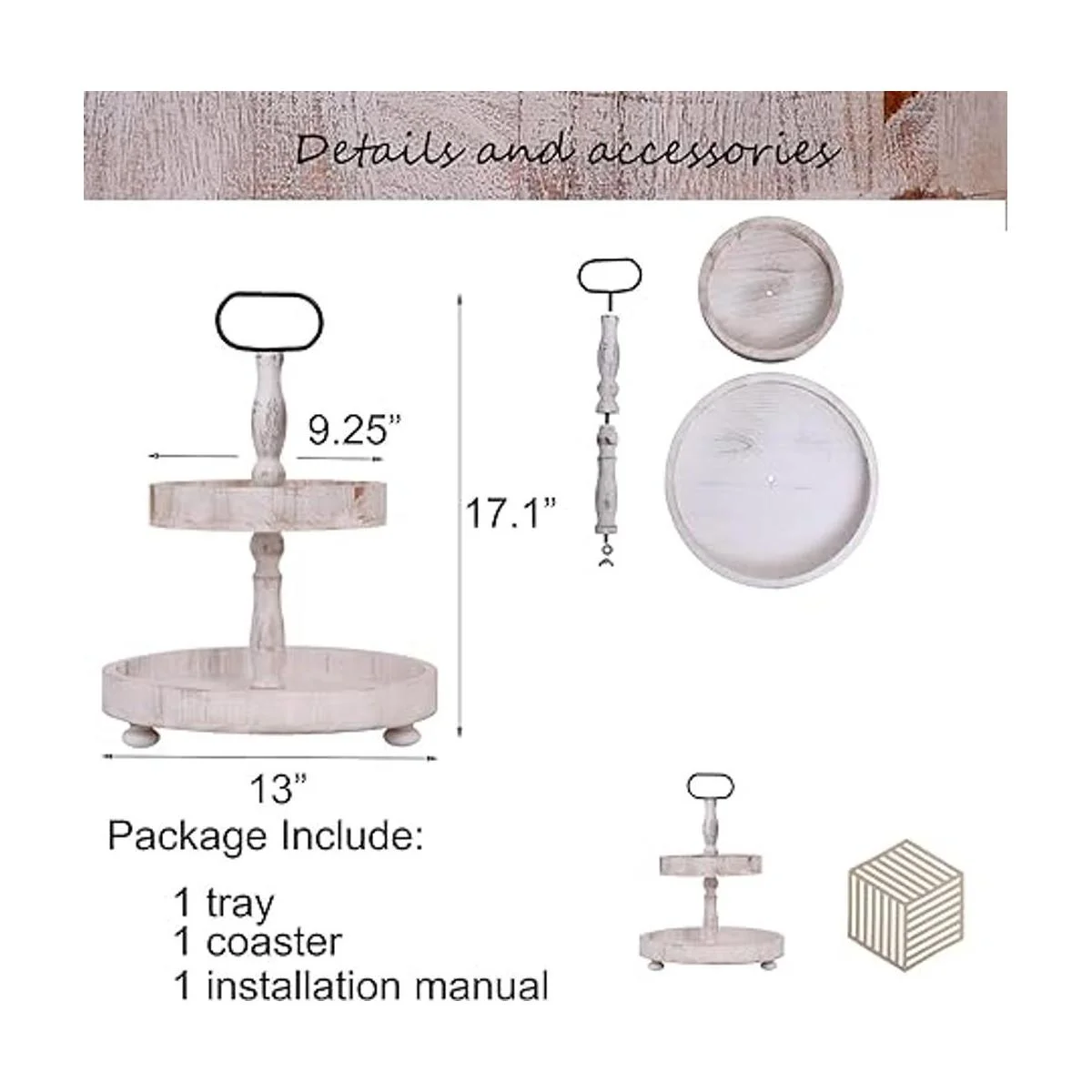 Dimensiones de la bandeja blanca rústica de 2 niveles: 17.1 x 13 x 9.25 pulgadas