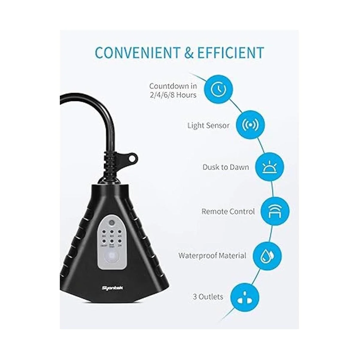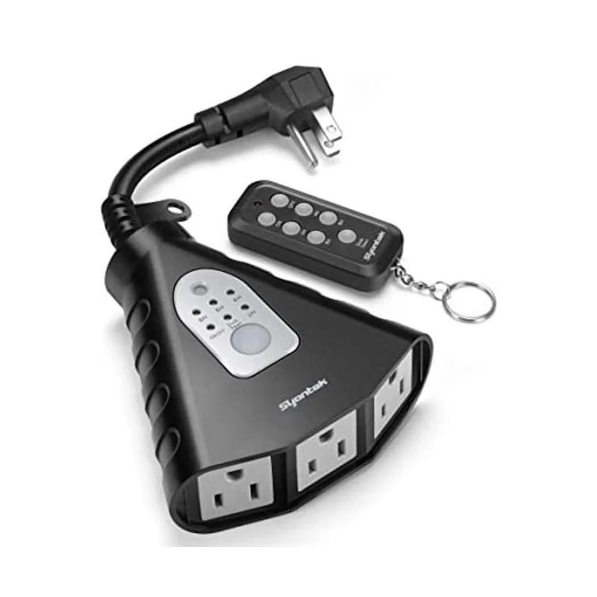 Syantek Toma de corriente inalámbrica para exteriores, enchufe inteligente para exteriores con 3 tomas de tierra, control remoto, temporizador, impermeable, certificado FCC para exteriores y luces navideñas, para Halloween, decoración de festivales de Navidad