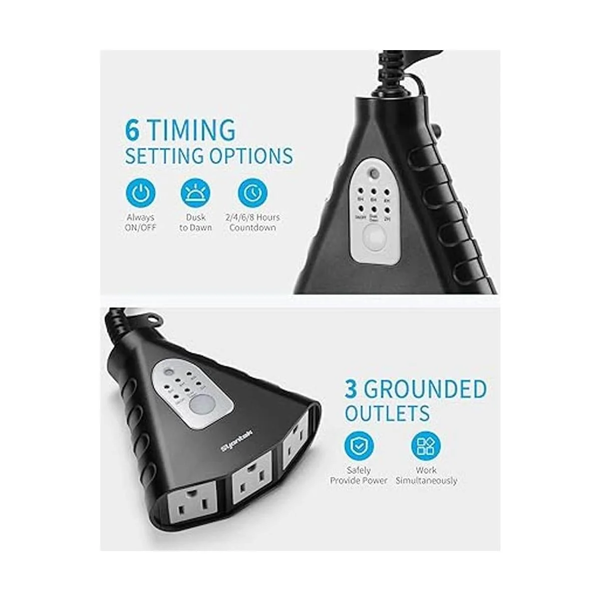 3 tomas de tierra con durabilidad mejorada: proporcionan energía de forma segura; funciona simultáneamente para hacer la vida más eficiente; alta calidad con material impermeable que protege las salidas en mal tiempo; uso seguro y duradero como temporizadores al aire libre para tomas eléctricas impermeables