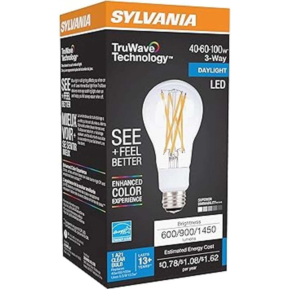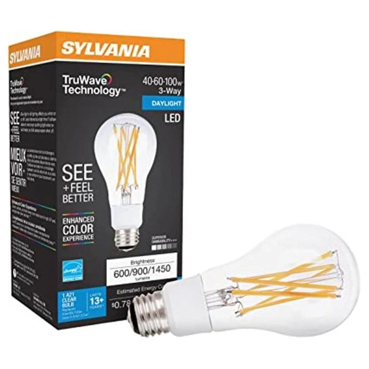 SYLVANIA Bombilla LED TruWave serie Natural A21 de 3 vías, equivalente a 4060100 W, eficiencia equivalente a 6.5913 W, base media, transparente 5000 K, luz diurna, paquete de 1 40770