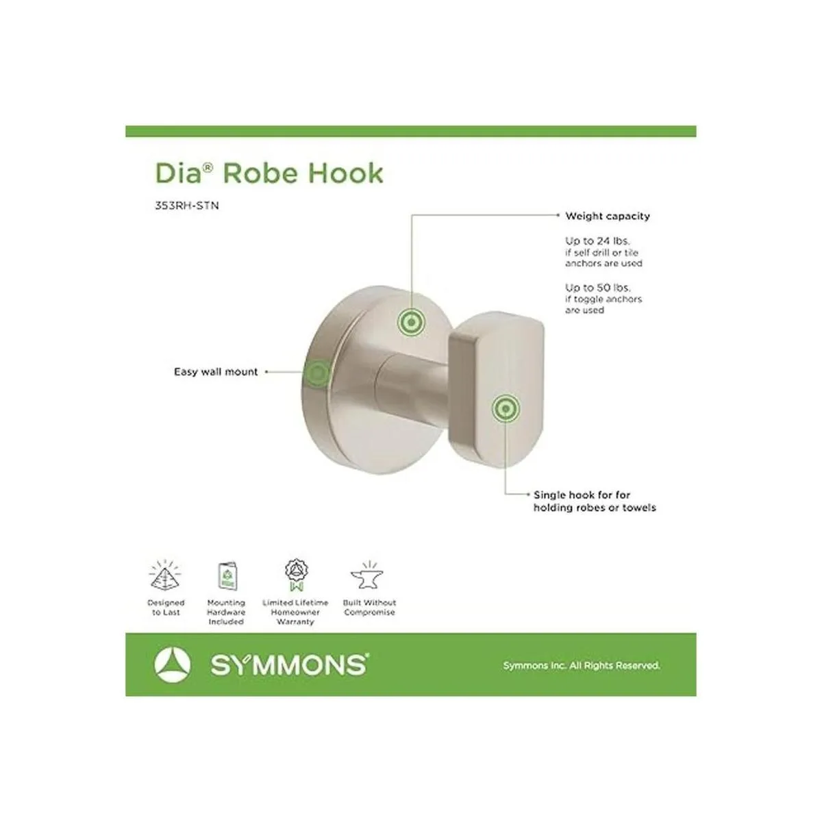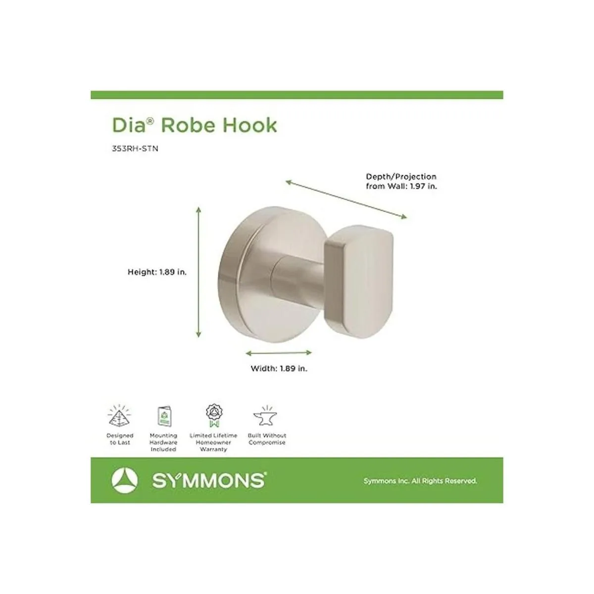 Symmons 353RHSTN Dia Gancho de pared para bata en níquel satinado