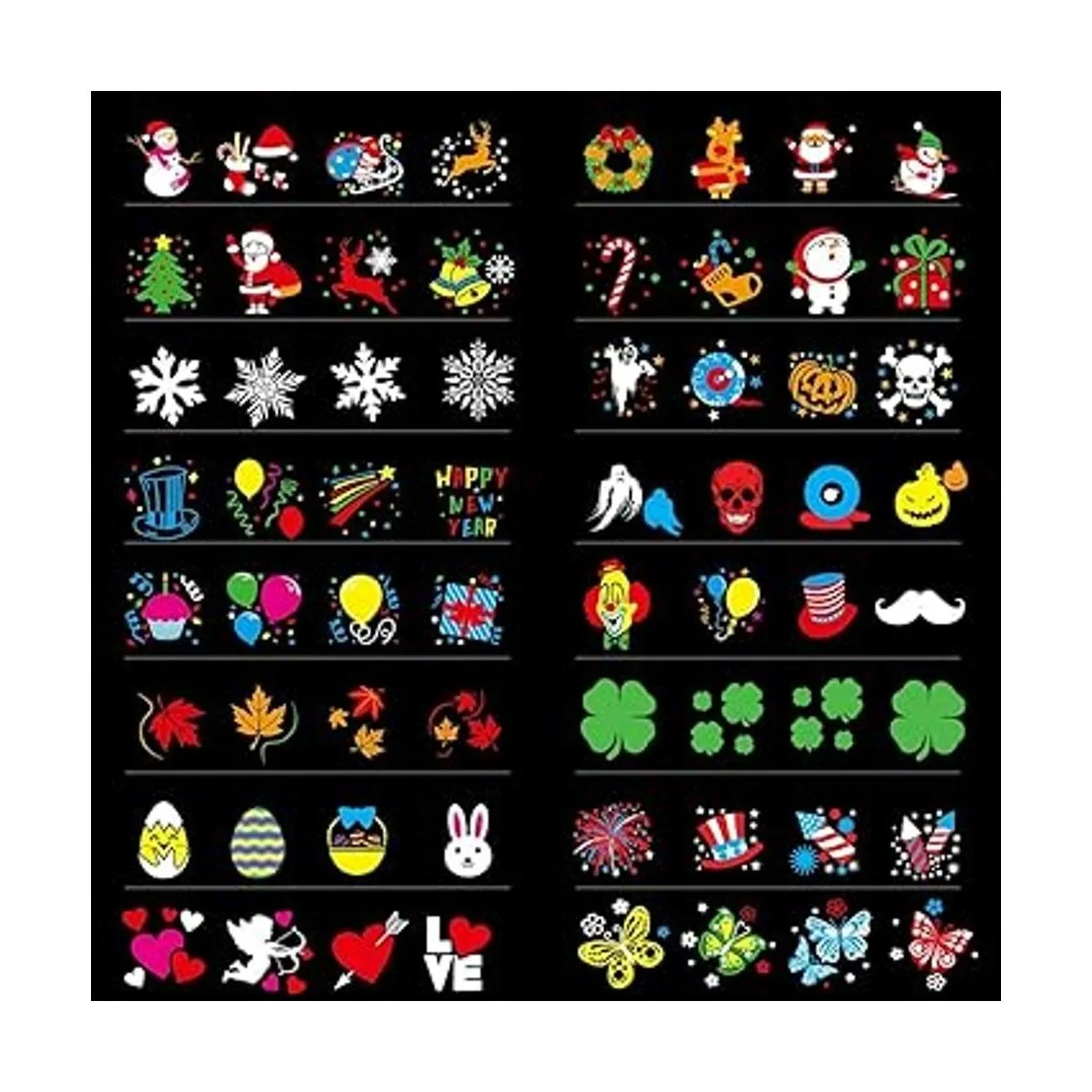 3 Navidad: copos de nieve blancos, símbolos de Navidad, decoraciones de Navidad, 3 Halloween: serie de cara de calabaza, serie de fantasmas de Halloween, serie de monstruos de Halloween, 10 celebraciones: Acción de Gracias, día de San Patricio, día de Pascua, día de los inquietos, día de la independencia, día de San Valentín, carnaval, cumpleaños, animales marinos, serie de parque infantil infantil, 4 diapositivas aleatorias.