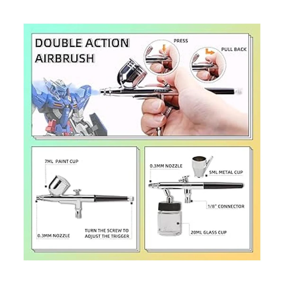 Más usos: es especialmente adecuado para colorear modelos, colorear accesorios grandes, maquillaje de cosplay, maquillaje SFX, etc. La presión del aire es rápida de arrancar, el diseño de la máquina y el aerógrafo es simple y conveniente, y la pintura se puede rociar directamente sin dilución si la pintura del aerógrafo está expuesta al aire durante mucho tiempo, necesita diluirse con agua para evitar que se seque y obstruya el aerógrafo. La proporción de pintura es de aproximadamente 1:3.