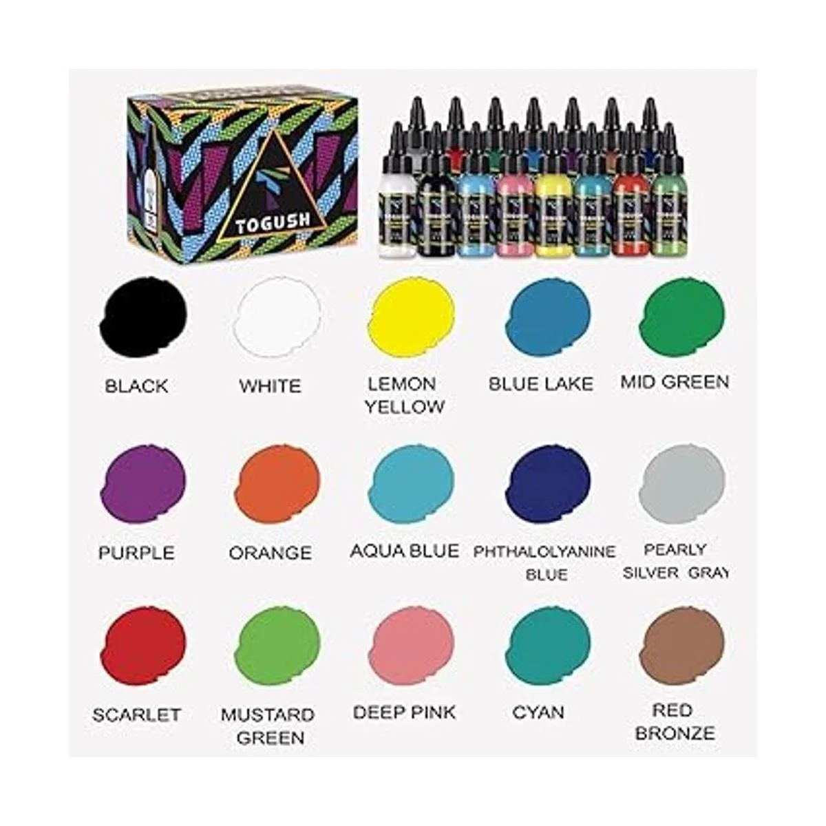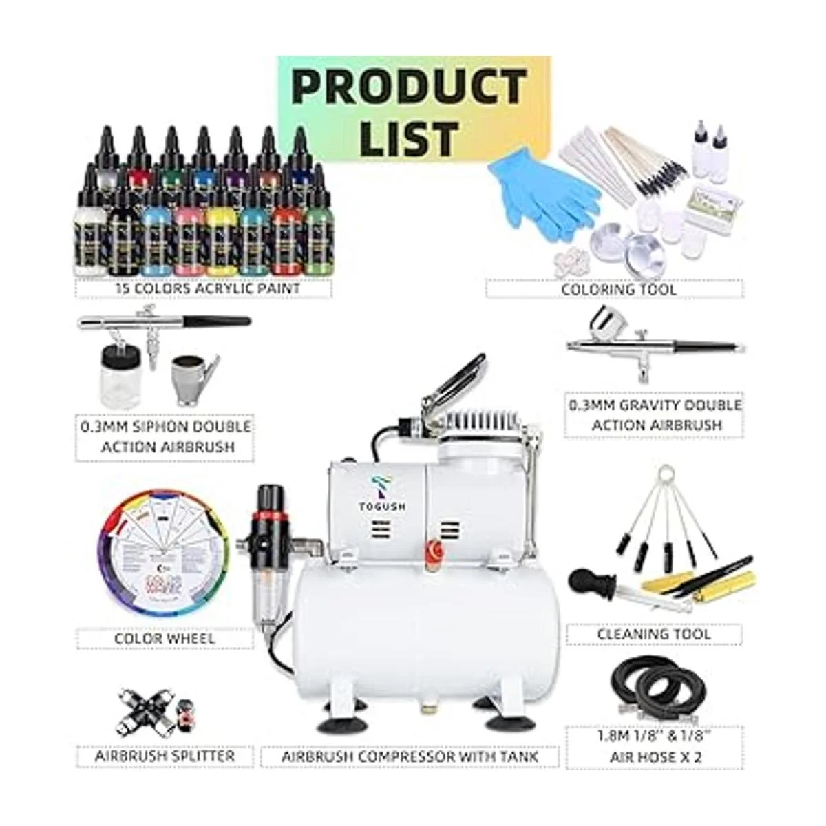 T TOGUSH Compresor de tanque de aire con aerógrafo de gravedad y sifón de aerógrafo de 15 colores de pintura acrílica para modelo, colorear, pasatiempos, manualidades, pintura de bricolaje
