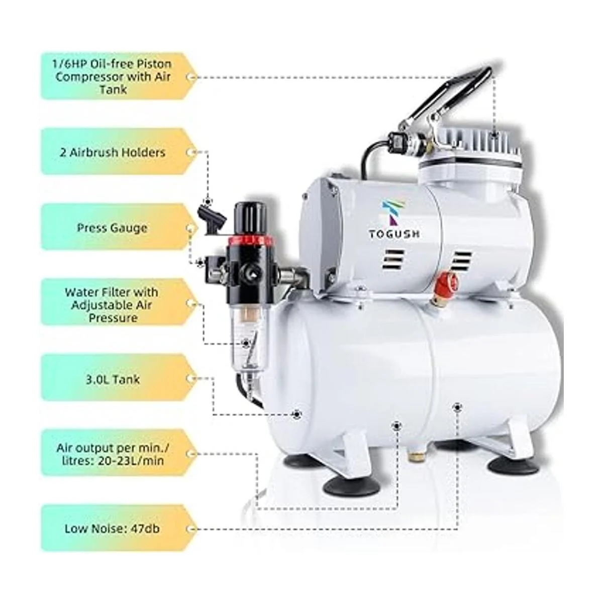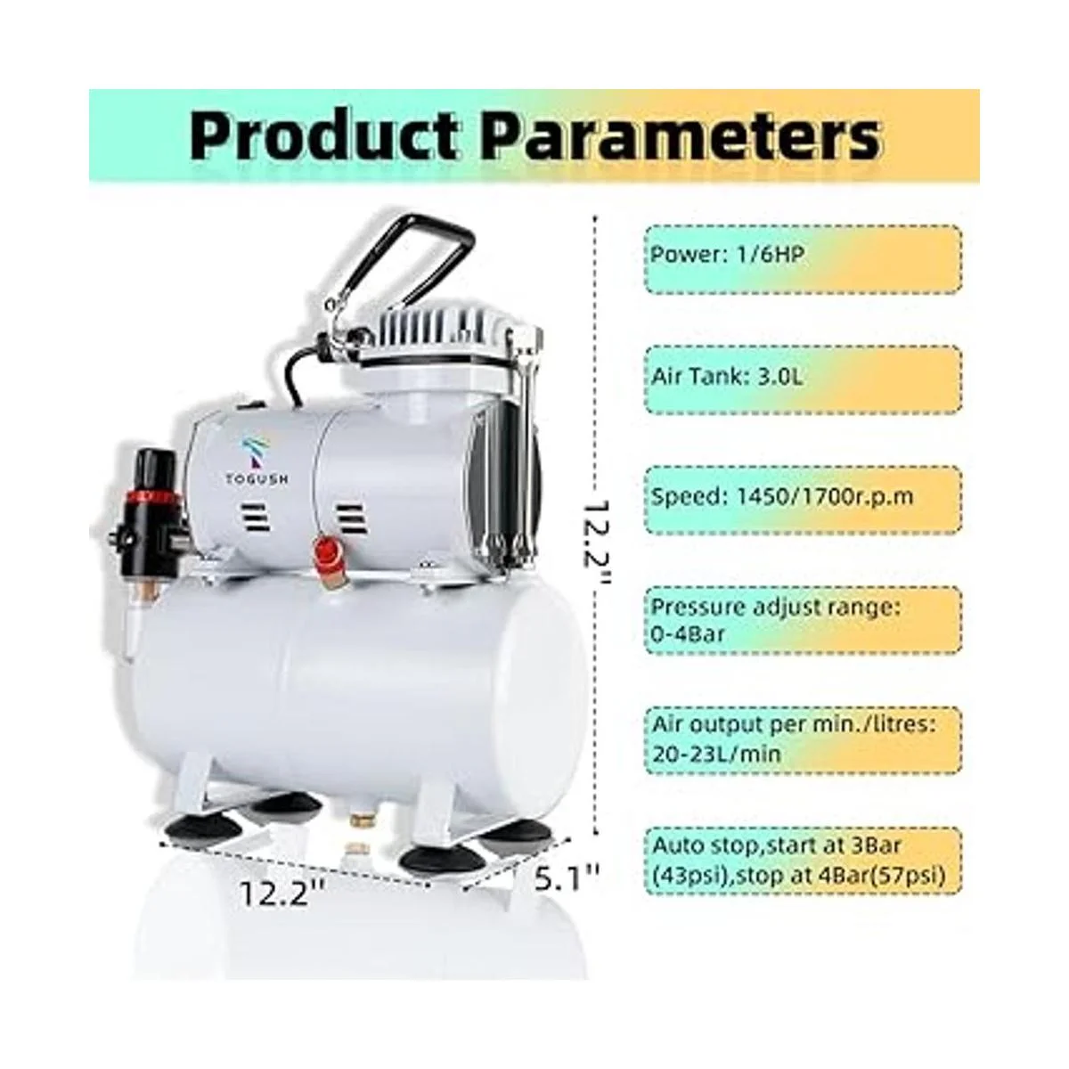 Compresor de aire de bajo ruido: el compresor de aire T TOGUSH con tanque está especialmente diseñado para trabajos de inyección de tinta de detalles finos. La máquina es pequeña en tamaño y ligera en peso, fácil de transportar y mover. Se puede utilizar directamente conectando el aerógrafo y girando el interruptor, y la presión del aire también se puede ajustar. El tanque de almacenamiento de aire de 3 L puede mantener la presión del aire estable durante un largo tiempo de trabajo de impresión, y el funcionamiento es suave y de bajo ruido, y también es muy adecuado para uso en interiores.