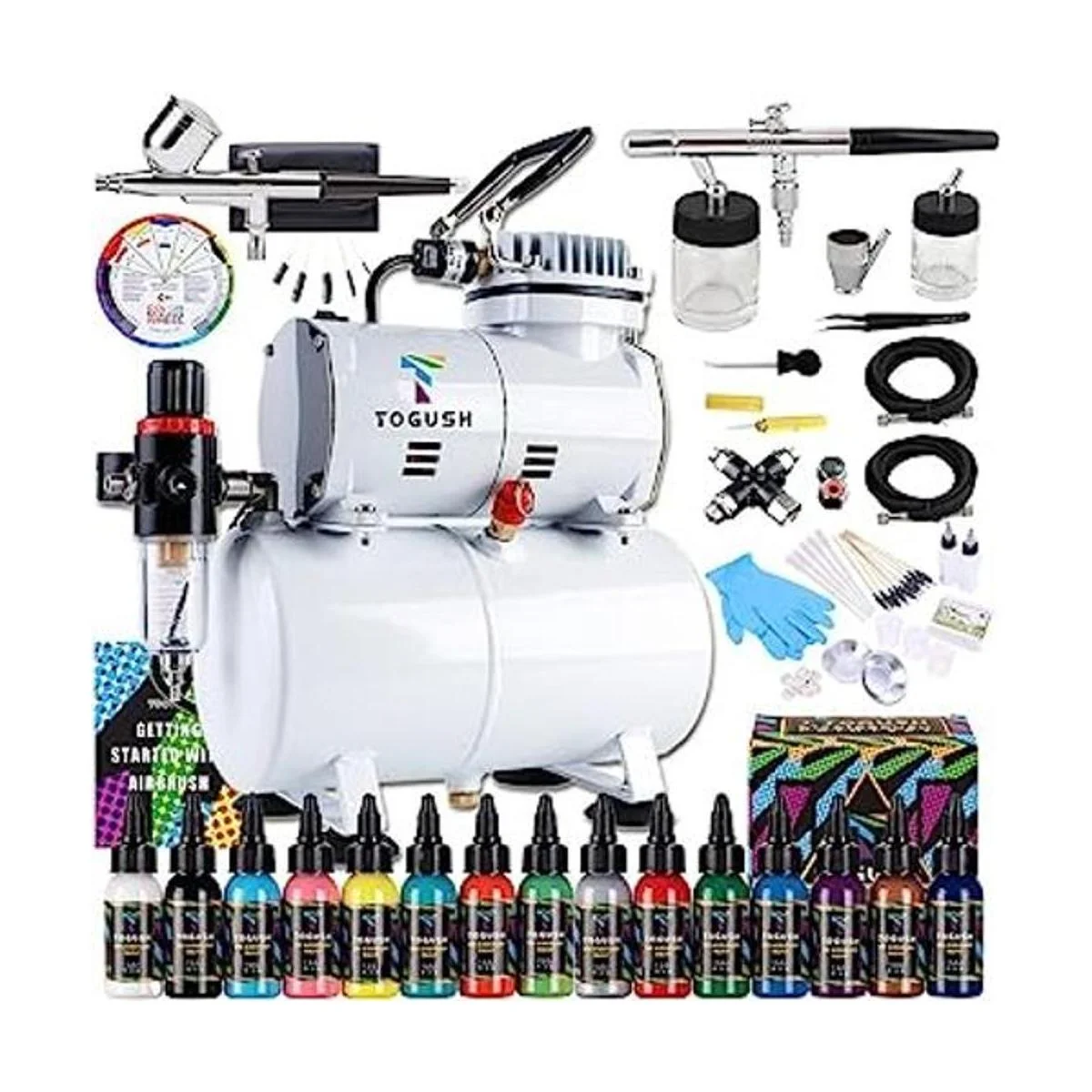 El juego incluye: el juego de colorear de T TOGUSH incluye compresor de tanque de almacenamiento de aire y 2 aerógrafos, un tipo de gravedad y un tipo de sifón, ambos aerógrafos tienen 0.012 in de diámetro; un juego de 1.0 fl oz de pintura acrílica; también incluye el divisor de aerógrafo y dos mangueras, los accesorios de colorear pueden satisfacer la mayoría de los trabajos de inyección de tinta. Los principiantes también pueden consultar la guía de uso rápido del aerógrafo, que es simple y conveniente.
