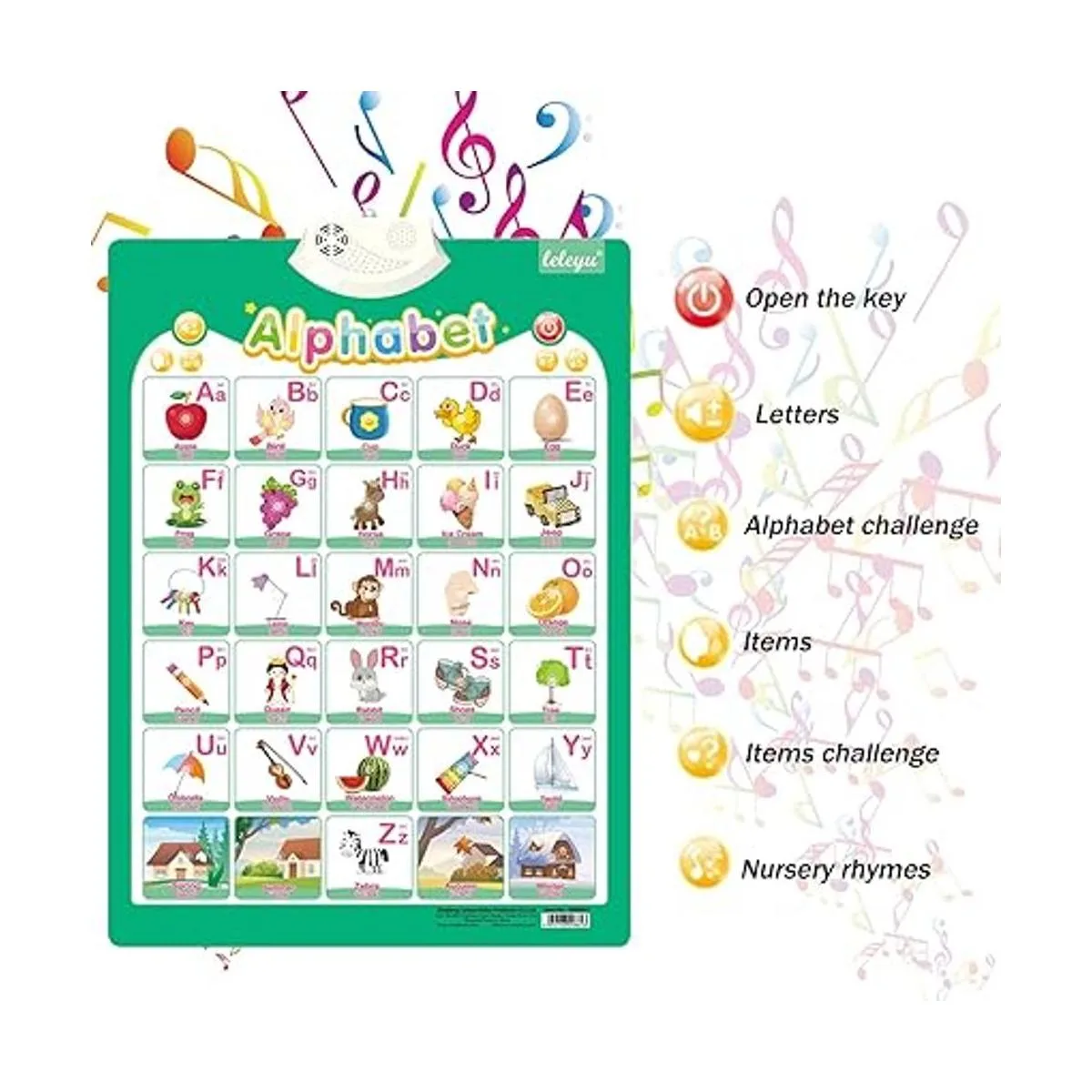 Divertidos juguetes de aprendizaje interactivos: el póster de pared de aprendizaje interactivo con pronunciación estadounidense puede establecer el contacto con tus hijos a través de reconocer el alfabeto y los vocabularios básicos. Juegos de preguntas con aliento y comentarios; reconocimiento de letras minúsculas y mayúsculas.