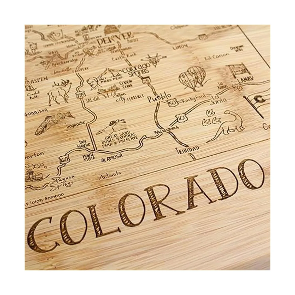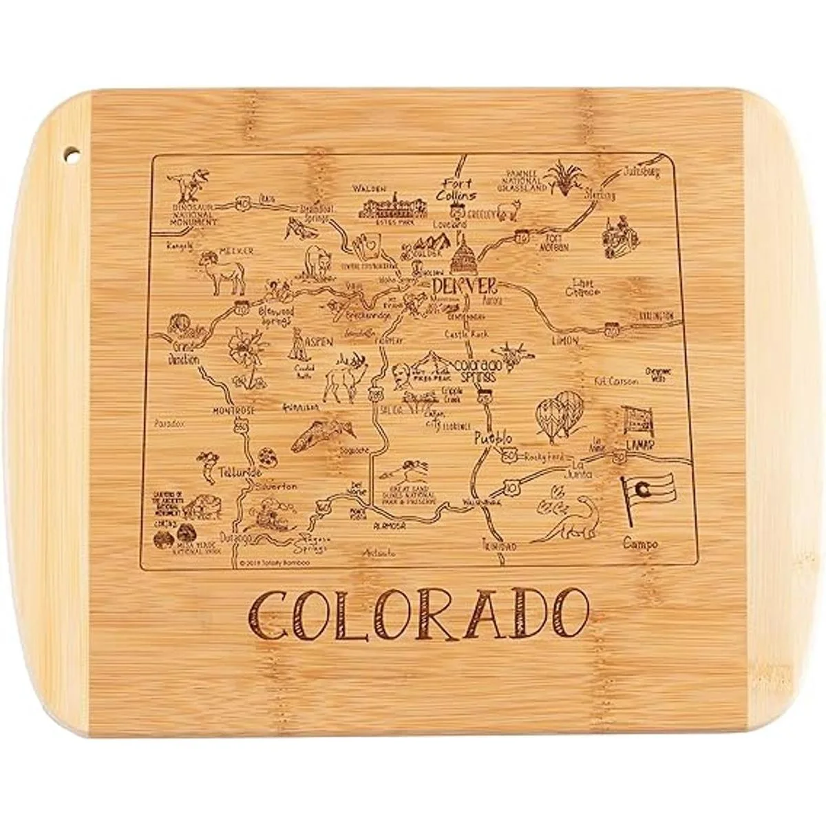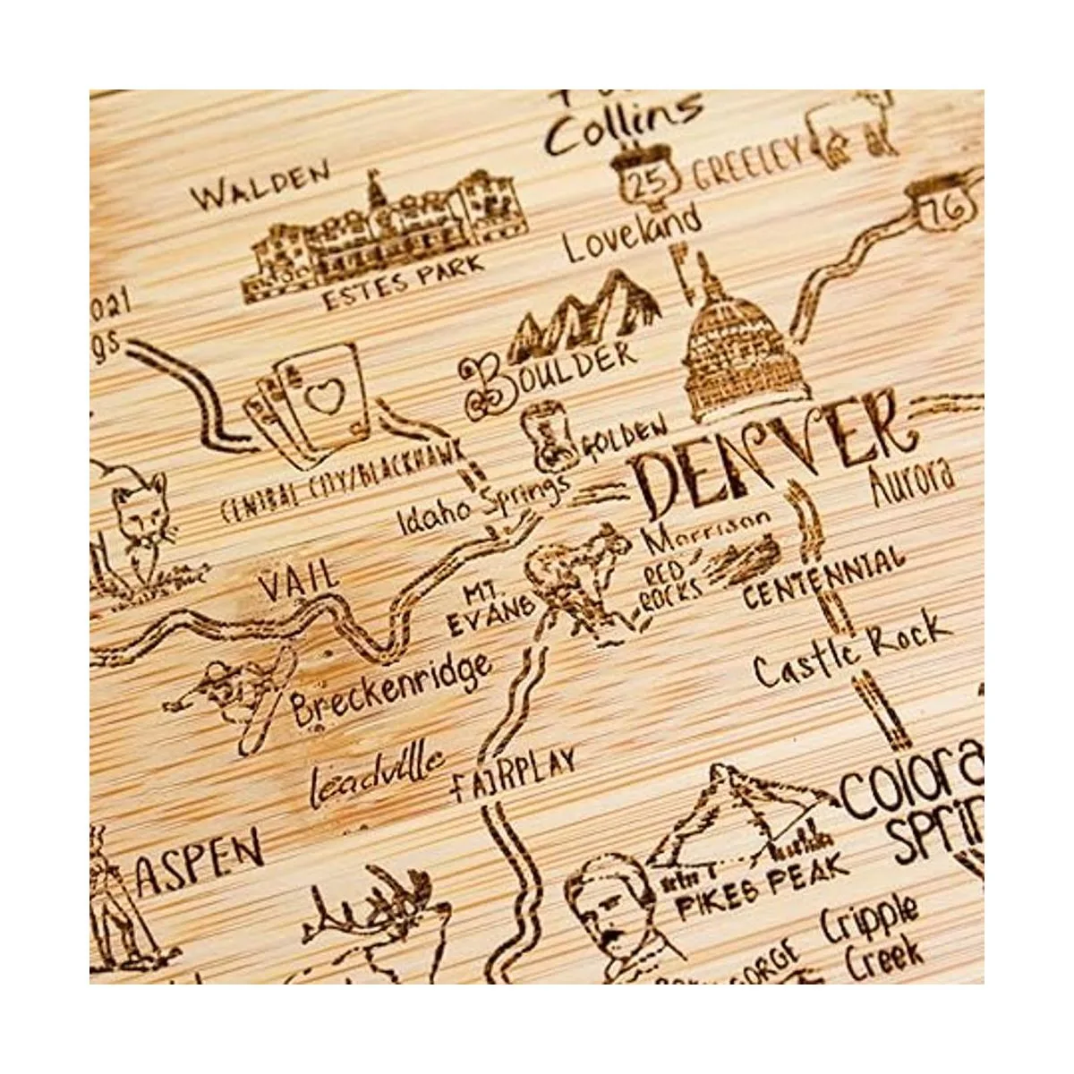 Saborea un trozo de The Centennial State con esta hermosa tabla de bambú para servir y cortar con ilustraciones inspiradas en las ciudades, lugares y personas de Colorado.