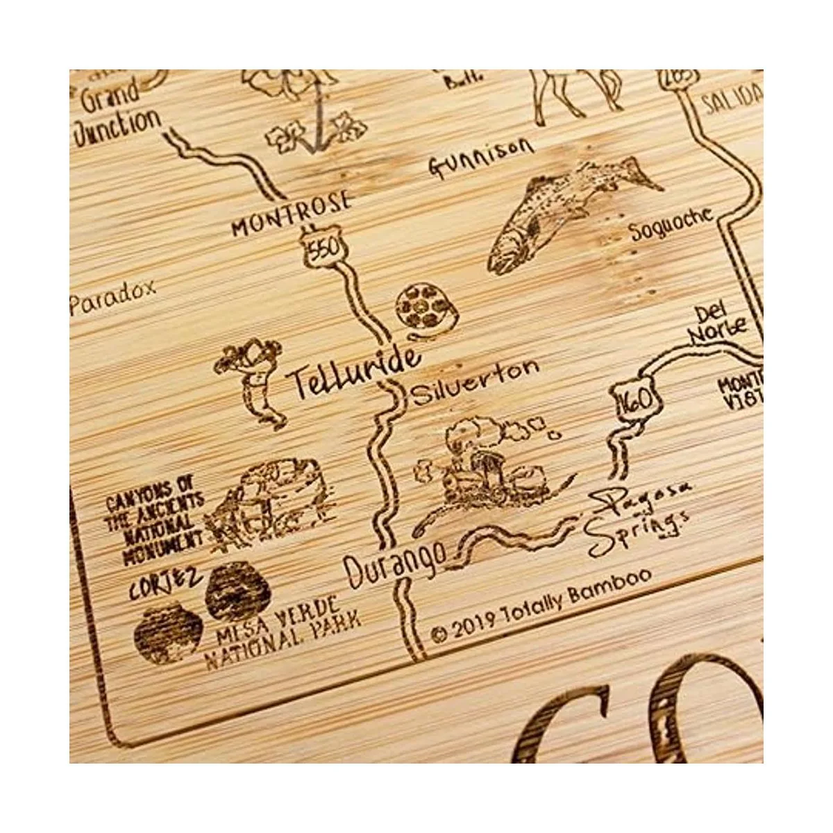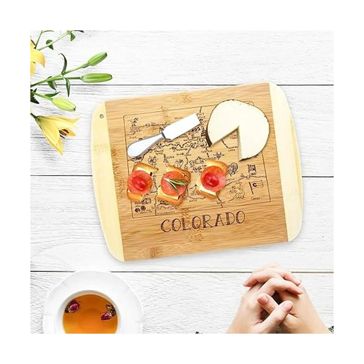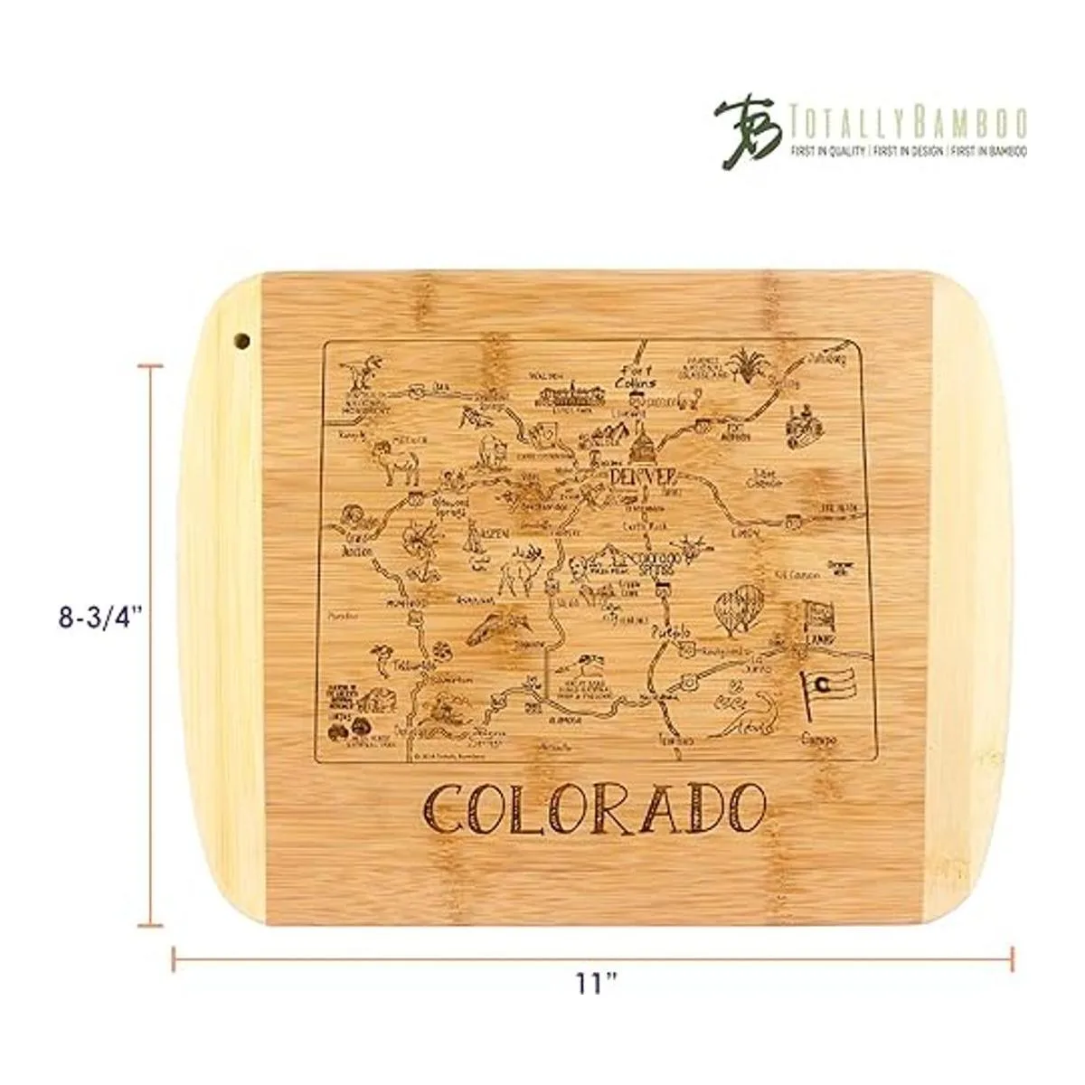 Saborea un trozo de The Centennial State con esta hermosa tabla de bambú para servir y cortar con ilustraciones inspiradas en las ciudades, lugares y personas de Colorado.