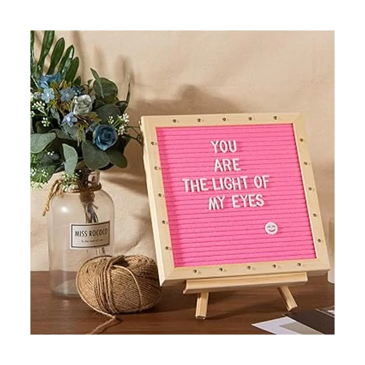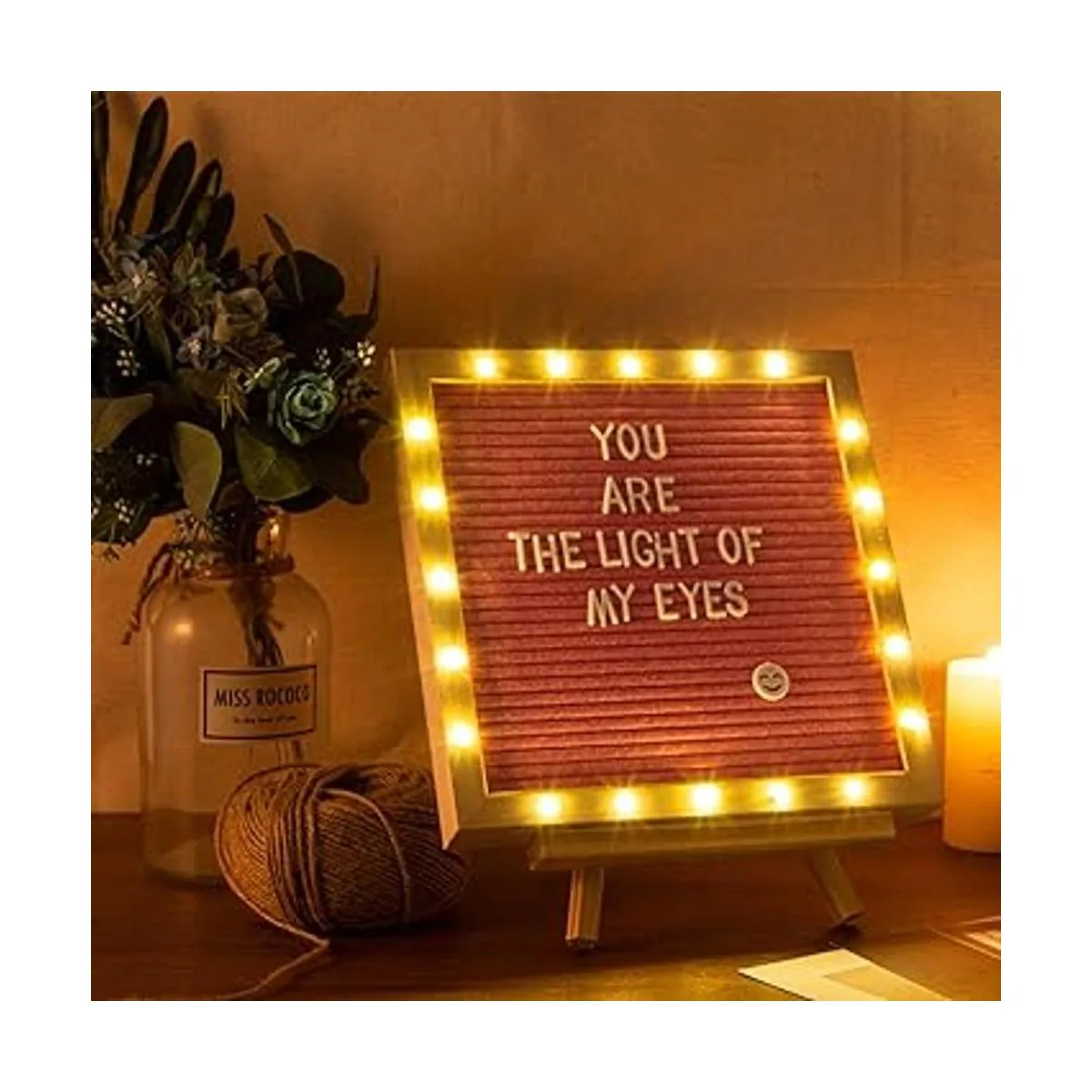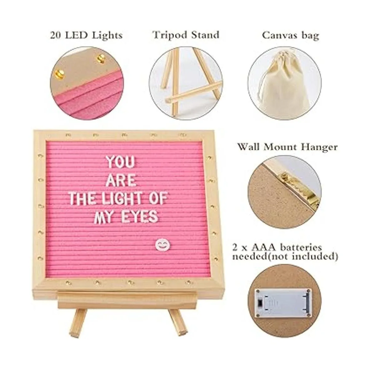 Tablero de letras de fieltro rosa con luces LED, tablero de mensajes cambiable de 10 x 10 pulgadas con marco rústico de madera vintage 510 precortado, soporte de trípode y colgador de montaje en pared para decoración del hogar de fiestas