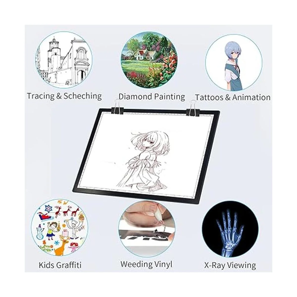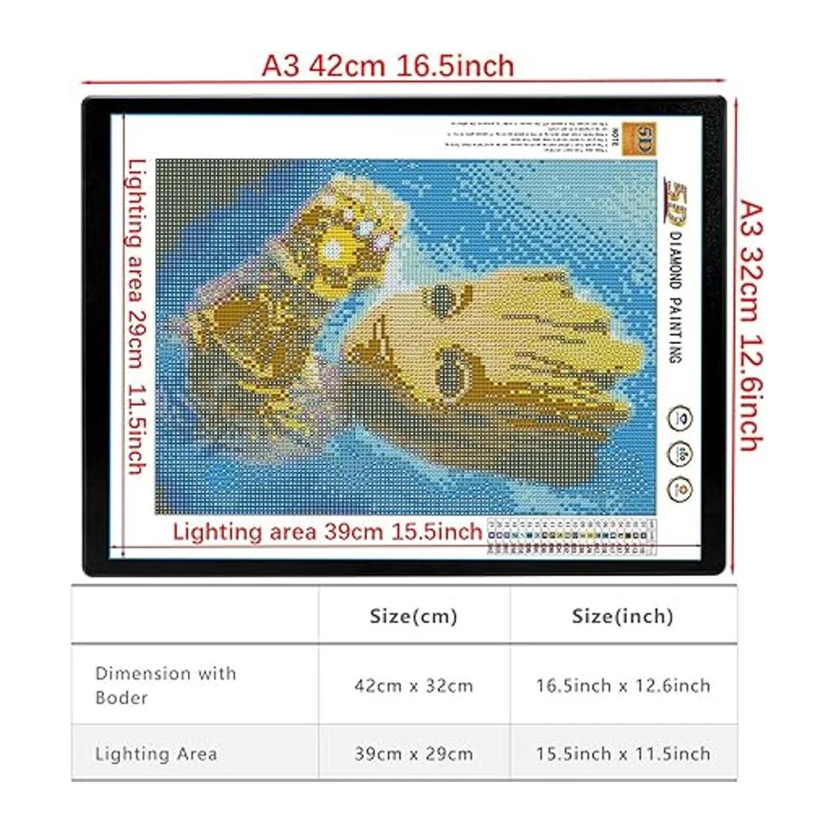 Tamaño más grande más conveniente: dimensión de la almohadilla de luz A3: 16.5 x 12.6 in. El tamaño más grande es conveniente para pintura de diamantes, vinilo de deshierbe, plantillas, animación 2D, caligrafía, relieve, álbumes de recortes, bocetos y dibujos, proyectos de costura, vidrieras, acolchados, apliques, etc