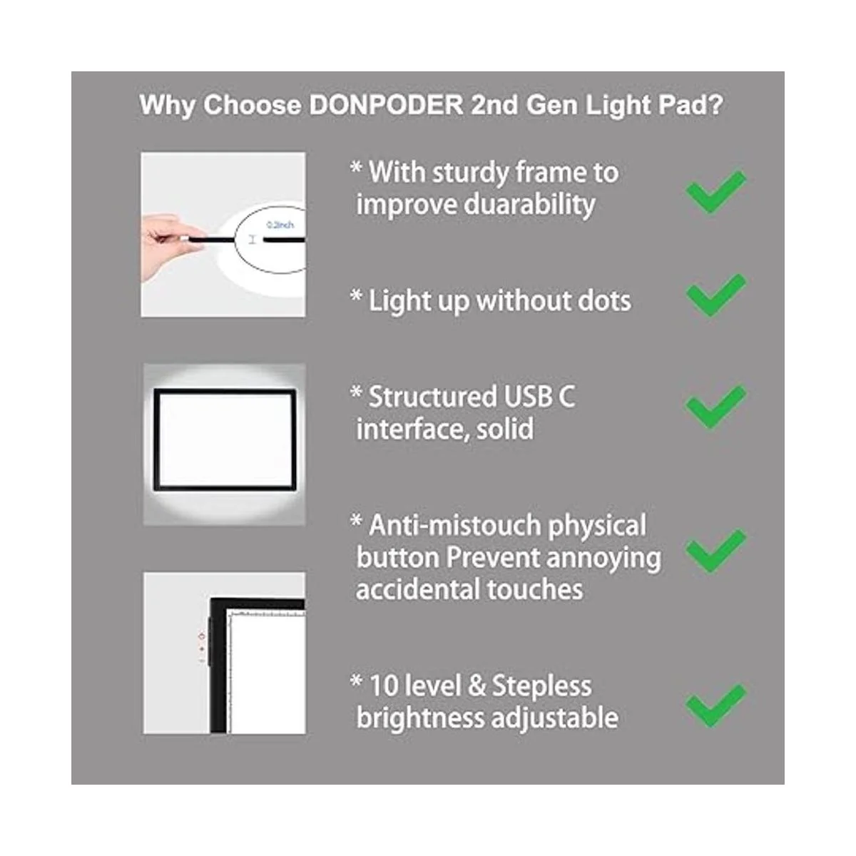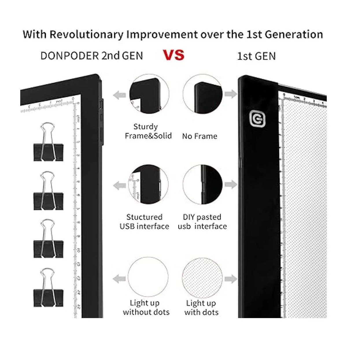 2 generación La placa de luz LED DONPODER A3 tiene un marco resistente para mejorar la durabilidad, más sólido, diseño de esquina redonda y borde, más seguro. Y debido al marco, no hay fugas de luz tan brillantes