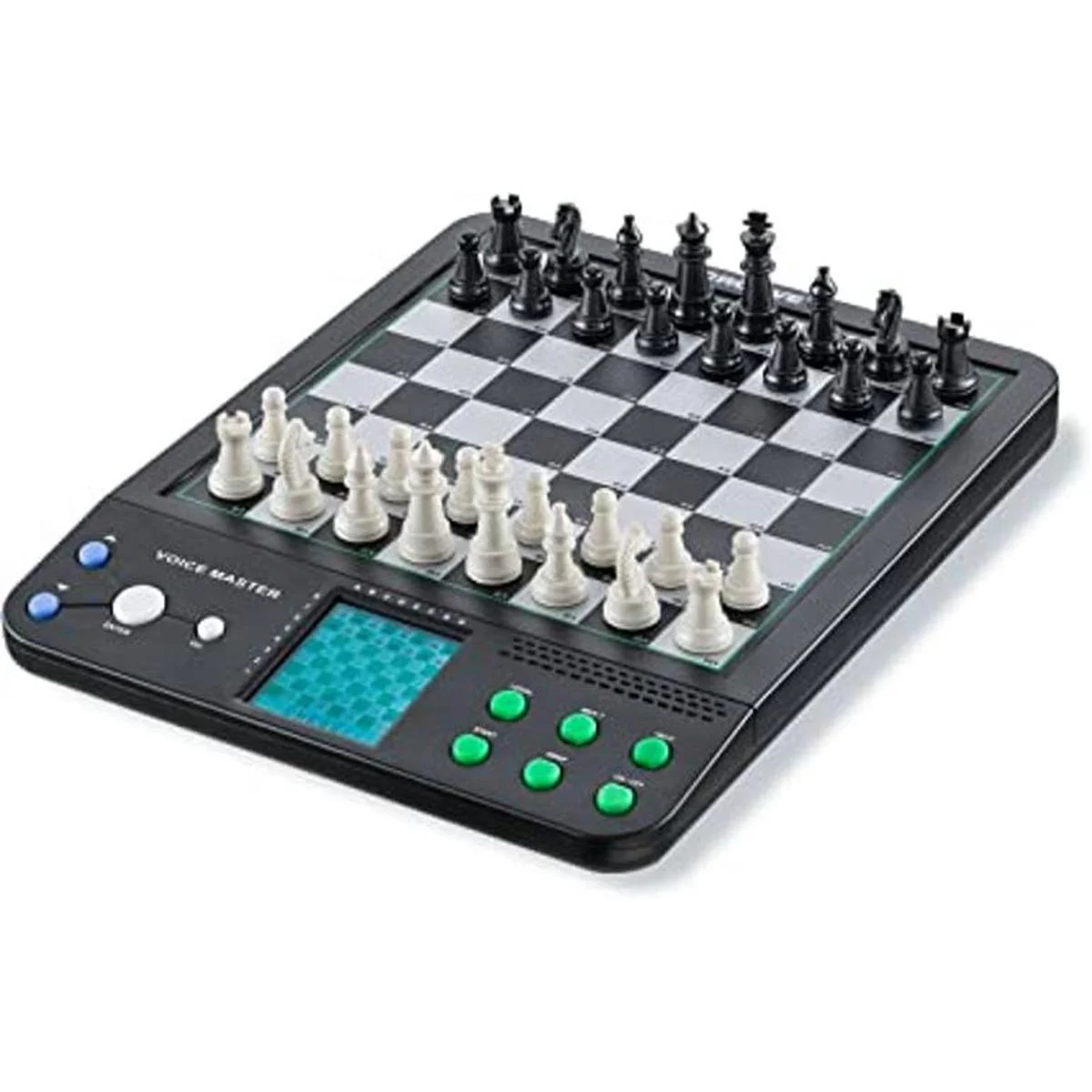 El paquete contiene tablero, piezas de ajedrez en blanco y negro, piezas de damas y una funda para las piezas cuando no están en uso. Funciona con 4 pilas AA no incluidas