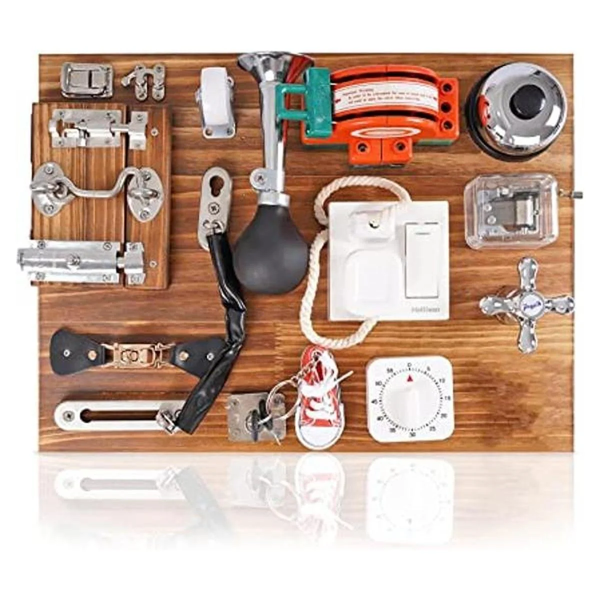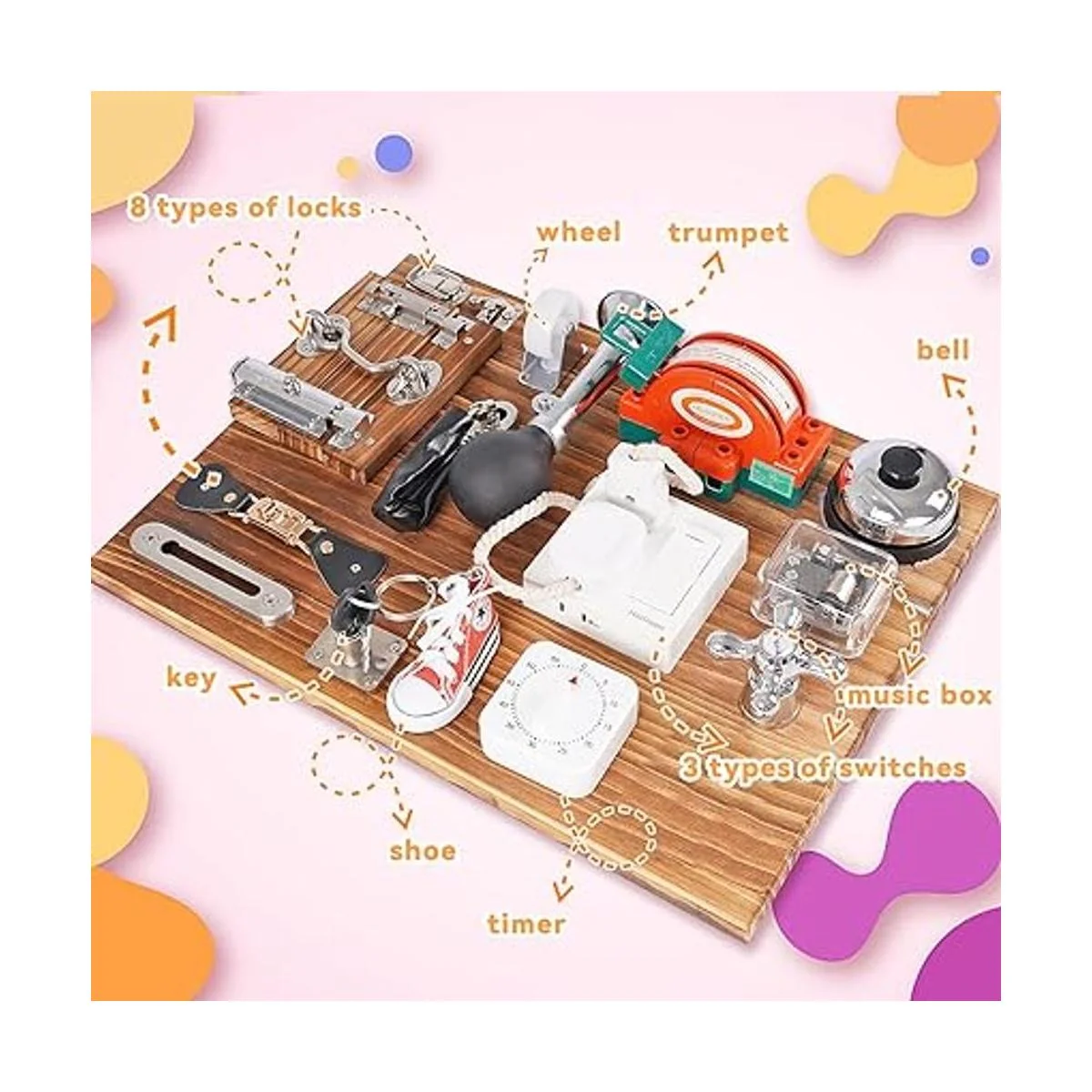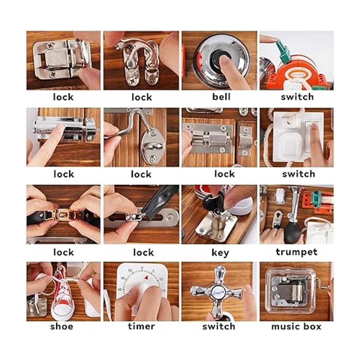 Tabla de montaje 18 en 1: nuestro gran juguete de aprendizaje de madera tiene pestillos de madera, interruptor, enchufe, válvula de puerta, anillos de contracción y zapatos, cerradura de llave, caja de música de mano y otras funciones de suministros diarios, para ayudar a los niños a ejercitar la habilidad motora