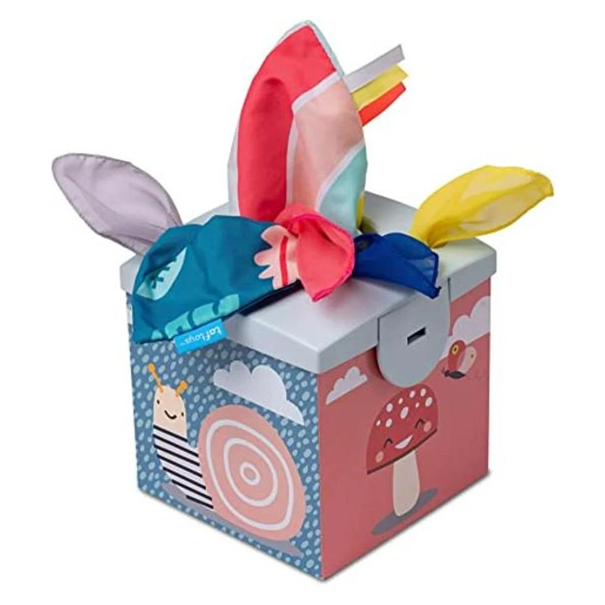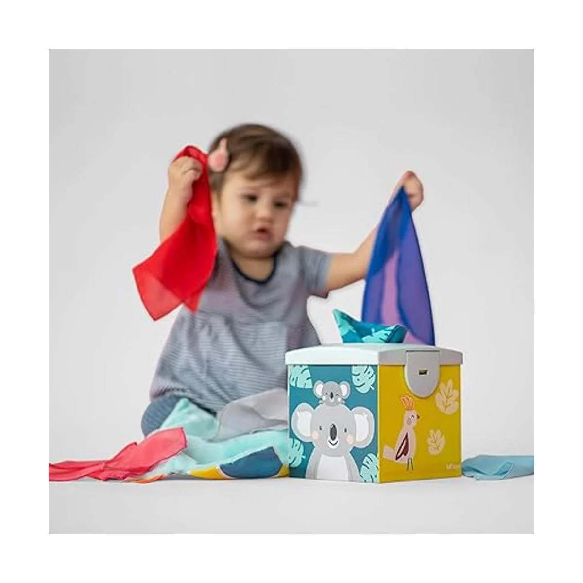 Taf Toys Caja de pañuelos sensoriales arrugados para niños pequeños. Hecha de caja de cartón fuerte y duradera con tapa de plástico, juguete Montessori de STEM, bufandas suaves coloridas y Blankies arrugados, desarrollo educativo y sensorial