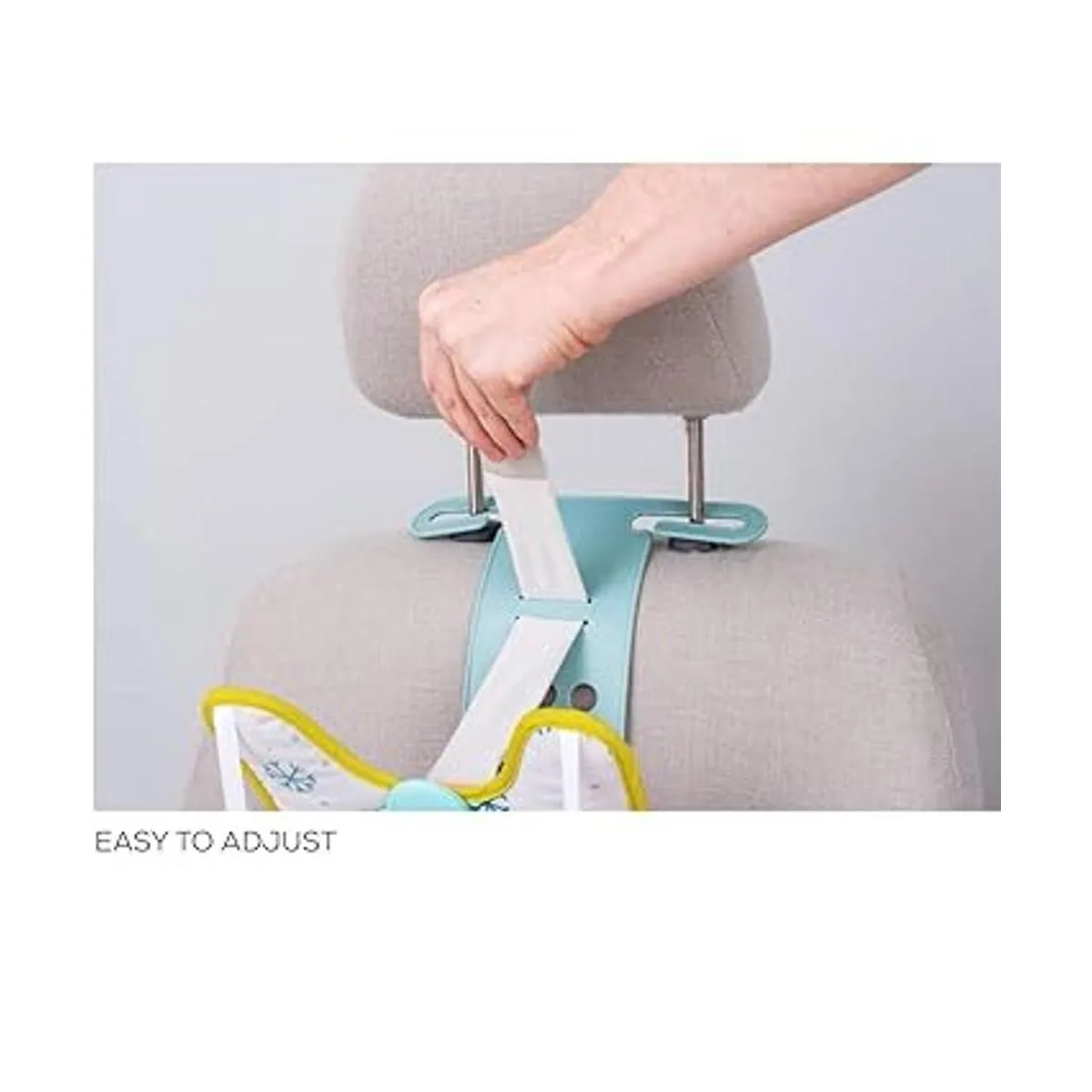 Juguetes de actividad suave para traquetear Arco iris arrugado, traqueteo Kimmy the koala y campanilla Scotty el caracol con un mordedor de bebé. Importante: el juguete es adecuado solo para coches con reposacabezas ajustable con postes de metal. Hay dos anillos triangulares de plástico para fijar a los postes de metal del reposacabezas.