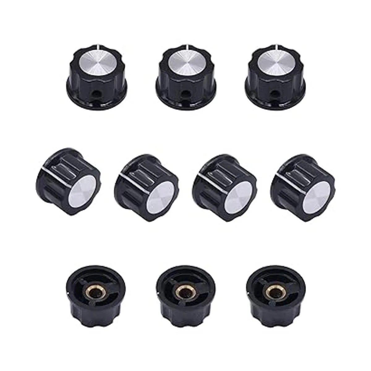 Taiss 10 pomos de potenciómetro, pomos giratorios, perilla superior de tono plateado para orificio de eje de 0.252 in. Diámetro superior de control de volumen 0.906 in, negro A030.252 in