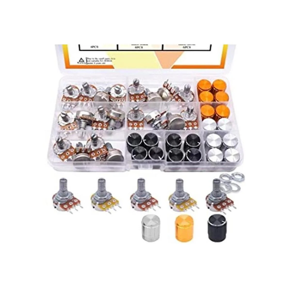 Taiss Kit de potenciómetro de 60 piezas B5K 10K 20K 50K 100K ohmios lineales, cónico, potenciómetro giratorio tipo B con tuercas, arandelas y 3 colores diferentes de pomos de aleación de aluminio F029