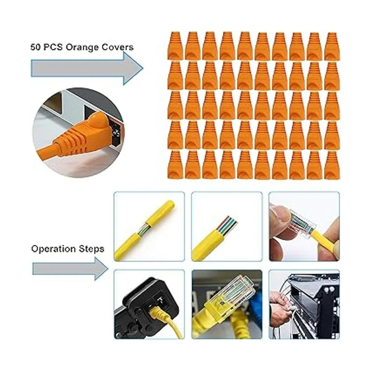 TAIWAIN CAT5 CAT6 RJ45 Kit de herramientas de crimpado Lan Cable Tester, herramienta de crimpado de red CAT5 CAT6, kit de reparación de pelado de cables Ethernet y crimpado RJ45, 50 conectores y 50 cubiertas amarillo