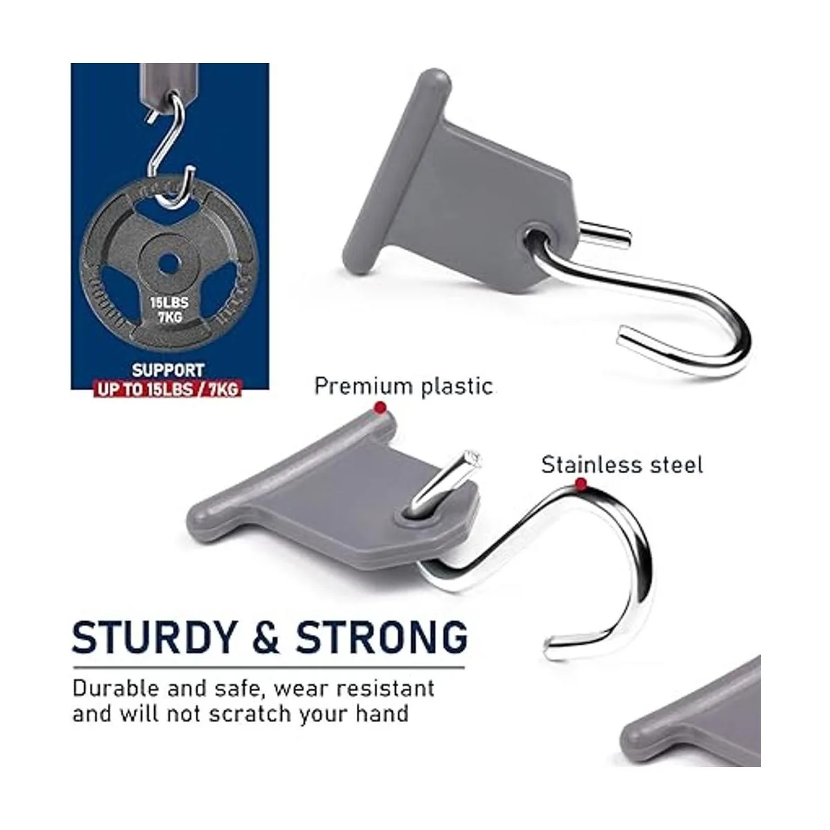 Material resistente y duradero: el gancho en forma de S está hecho de acero inoxidable. Es fuerte, duradero y seguro, resistente al desgaste y no raya tu mano cuando lo utilices. El soporte de gancho está hecho de plástico resistente, no se deforma ni se dobla fácilmente, de larga duración y reutilizable. Cada uno puede soportar objetos pesados de hasta 15 libras.