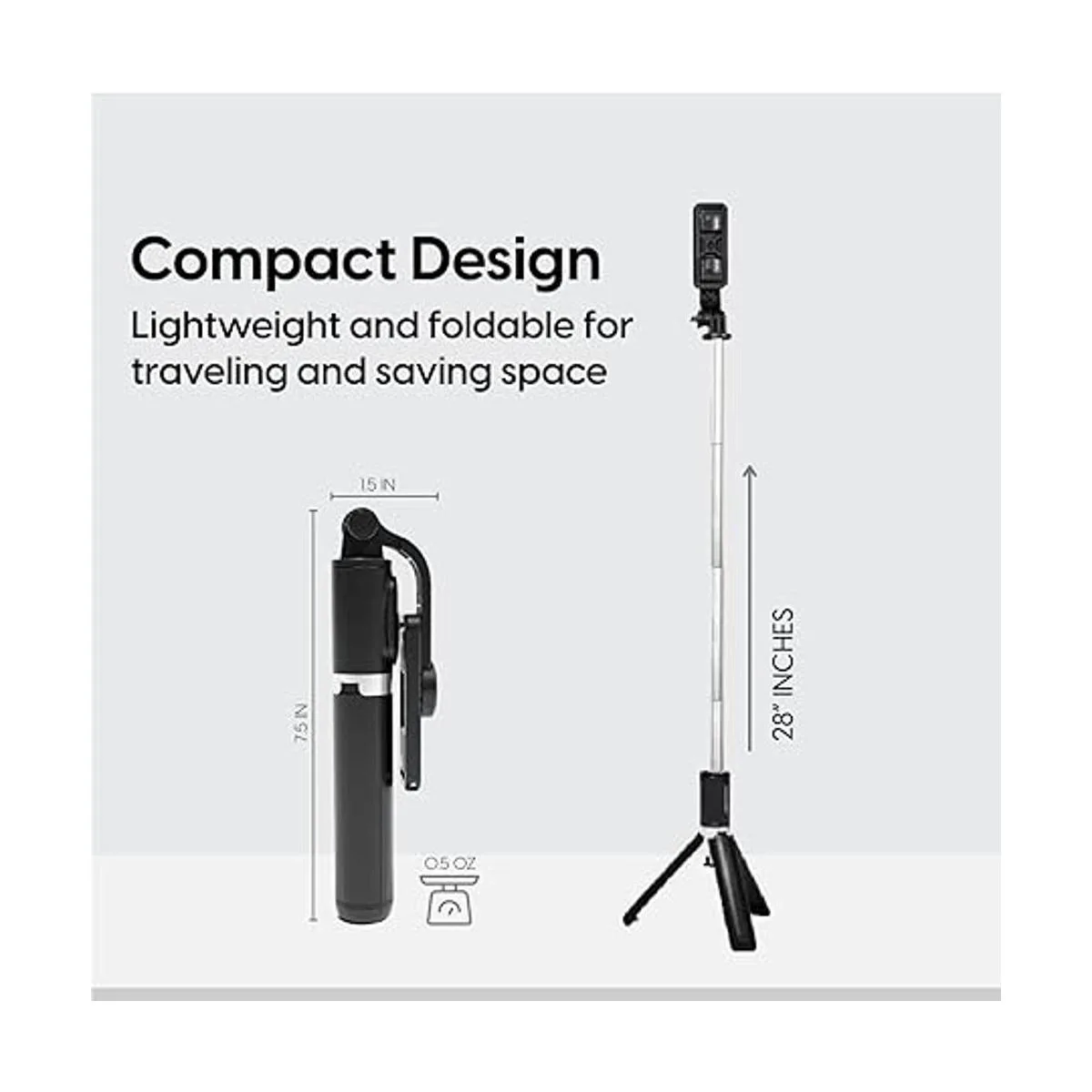 El soporte de trípode es extremadamente portátil, ligero, compacto y plegable, ideal para viajes y fotografía. Para el modo trípode, simplemente abre el mango hacia afuera y tira de la última sección del poste para ajustar para que se asiente en una mesa.