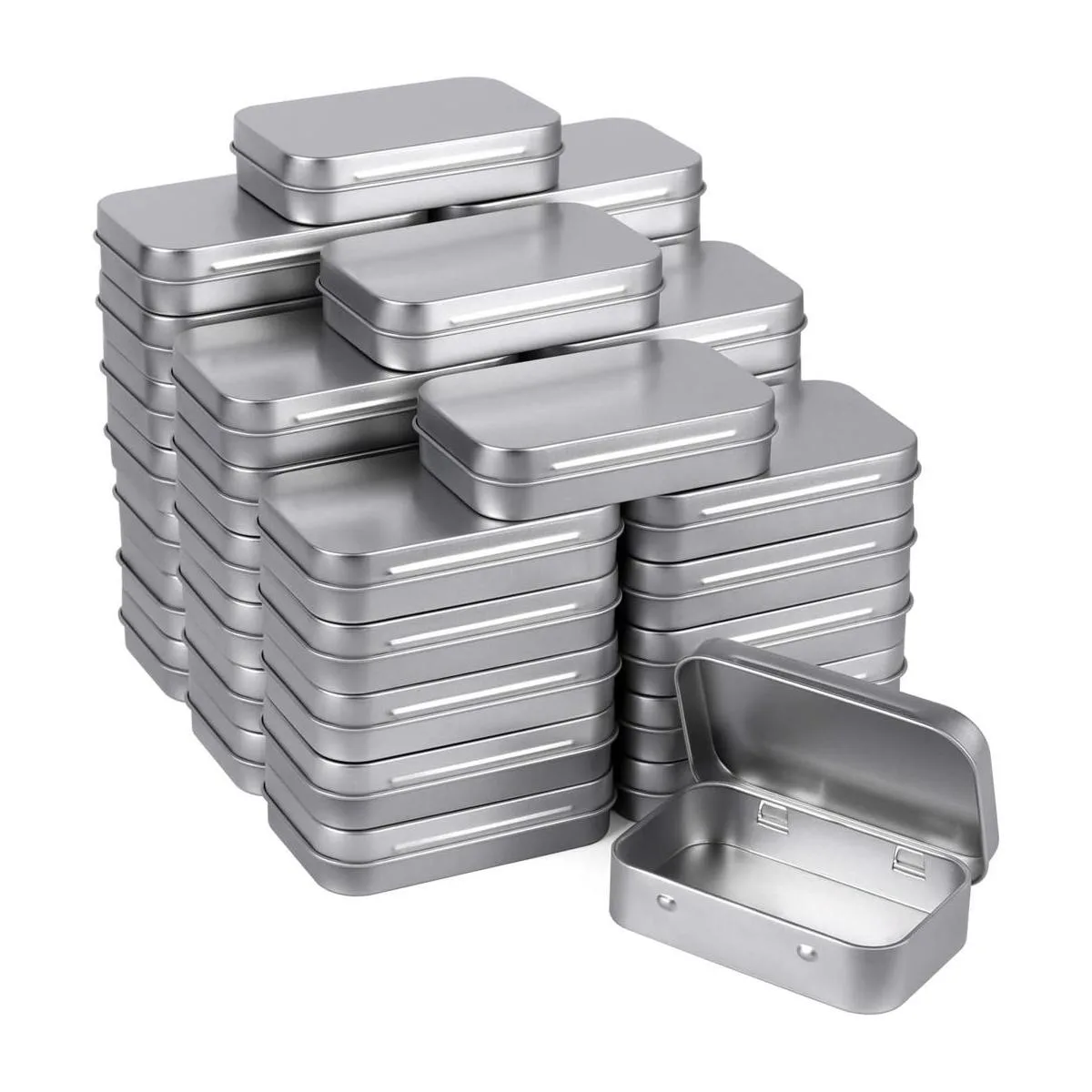 Tamicy Latas rectangulares de metal vacías con bisagras, paquete de 40 mini recipientes portátiles plateados, kit de almacenamiento pequeño y organizador para el hogar, latas pequeñas con tapas, contenedores de manualidades de 312 x 212 x 45 pulgadas