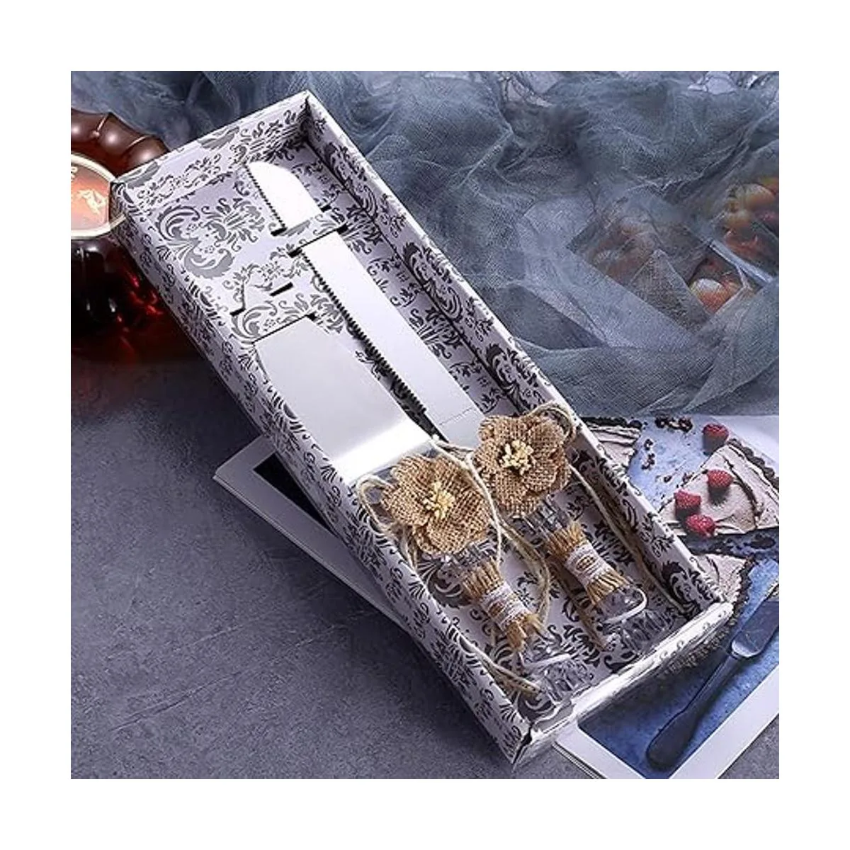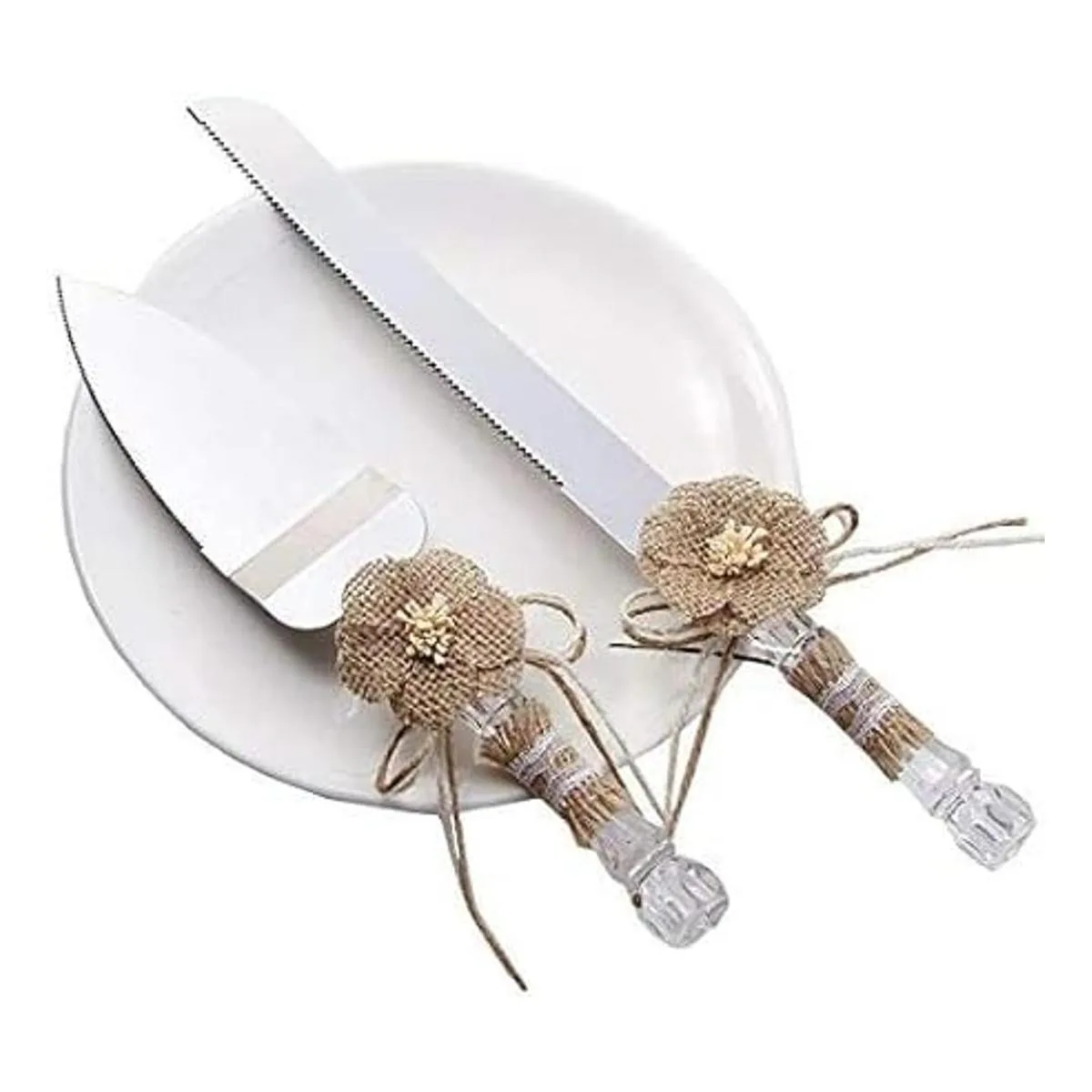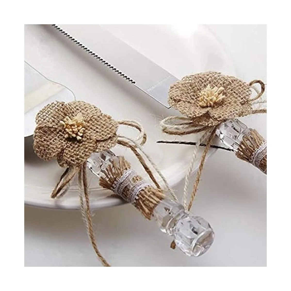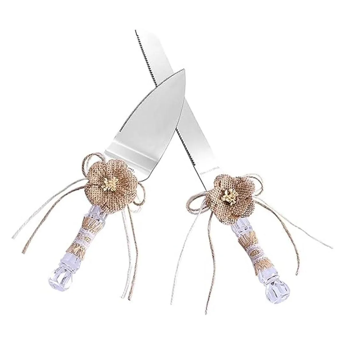 TANG SONG Juego de 2 cuchillos rústicos para pastel de boda y servir con flores de arpillera y cuchillo de encaje para pastel de boda juego de 2