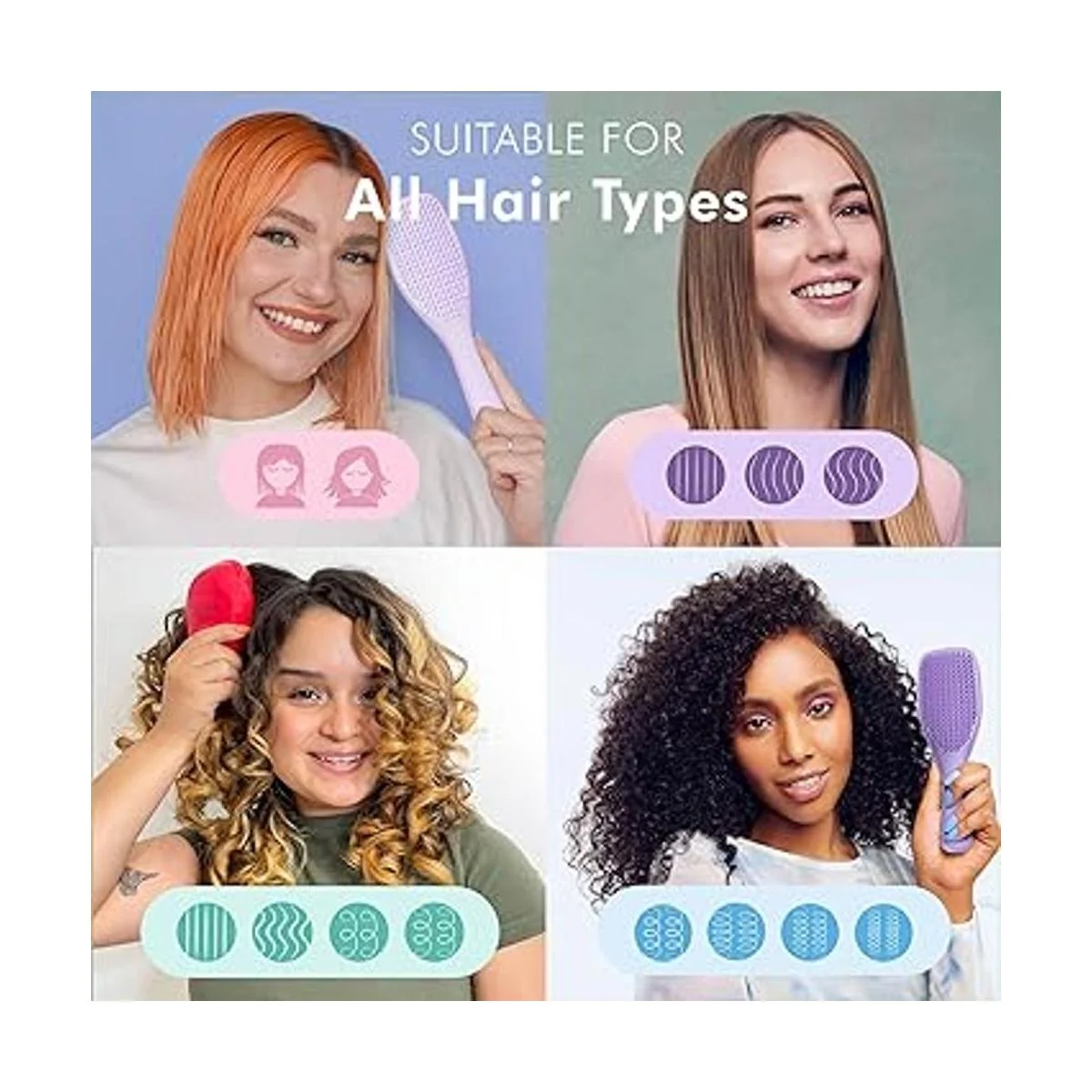 Los dientes patentados tienen tecnología de dos niveles con flexibilidad adicional para cabello húmedo. Los dientes largos y flexibles desenredan, eliminan nudos y reducen la rotura, mientras que los dientes cortos son suaves, para un cabello brillante y sin encrespamiento.
