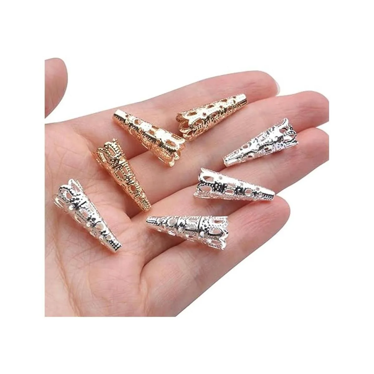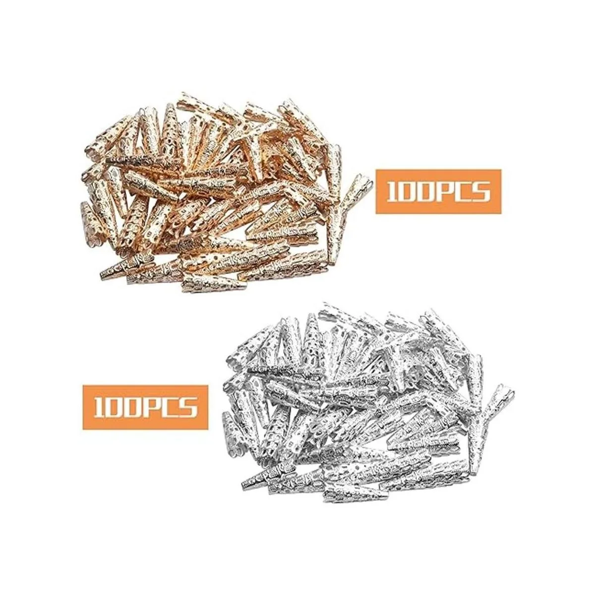 Obtendrás: hay 200 tapas de cuentas de conos, los colores son dorados y plateados, cada uno contiene 100 unidades. La cantidad es suficiente para que puedas diseñar todo tipo de joyas.