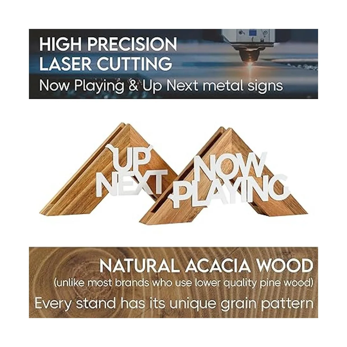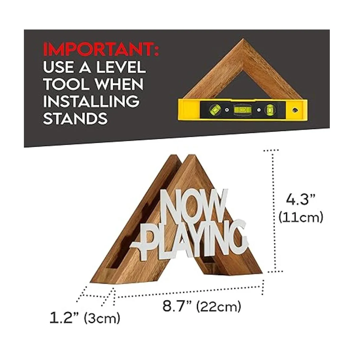 Material de alta calidad: Buscas algo con mejor calidad que el plástico impreso en 3D habitual ahora jugando Nuestros soportes triangulares para discos de pared están hechos a mano con madera de acacia de alta calidad, cada uno con granos de madera únicos a diferencia de otros que utilizan madera de pino. Mientras que ambos carteles de texto desmontables están cortados con láser con alta precisión y pintados en aerosol en blanco.