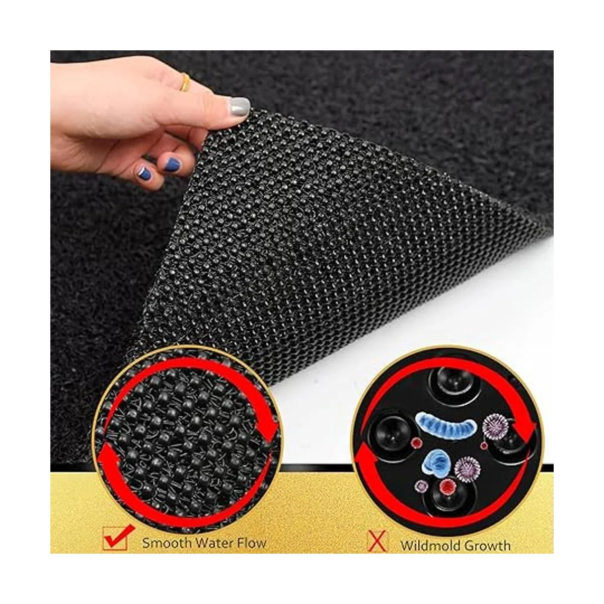 Fácil de limpiar y de secado rápido: nuestra alfombrilla de ducha antideslizante se mantiene en su lugar y se seca muy rápido. Permite totalmente que el agua se drene hasta el drenaje de la ducha sin ningún respaldo de agua. Esta alfombrilla de baño tampoco retiene el agua, por lo que es fácil de recoger sin ensuciar. Después de la ducha, simplemente enjuaga con agua después de cada uso y seca al aire para mantener un aspecto como nuevo. Nota: se recomienda encarecidamente limpiar la alfombrilla de baño antes del primer uso.