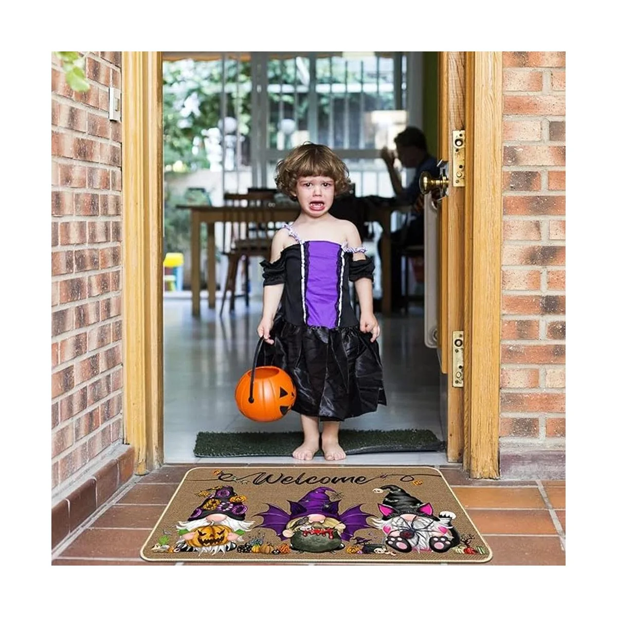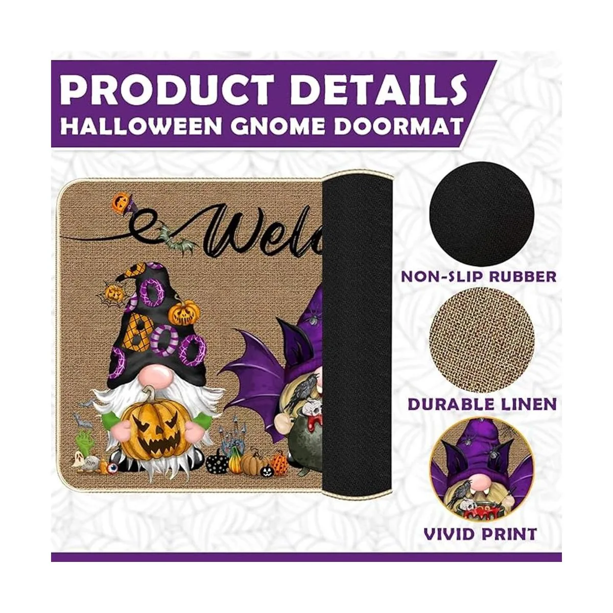 Diseño clásico de temporada: tapete de bienvenida de Halloween especialmente diseñado con gnomo, calabaza, murciélago, araña, cuervo, etc., elementos, añadiendo un ambiente festivo a la entrada de tu hogar.