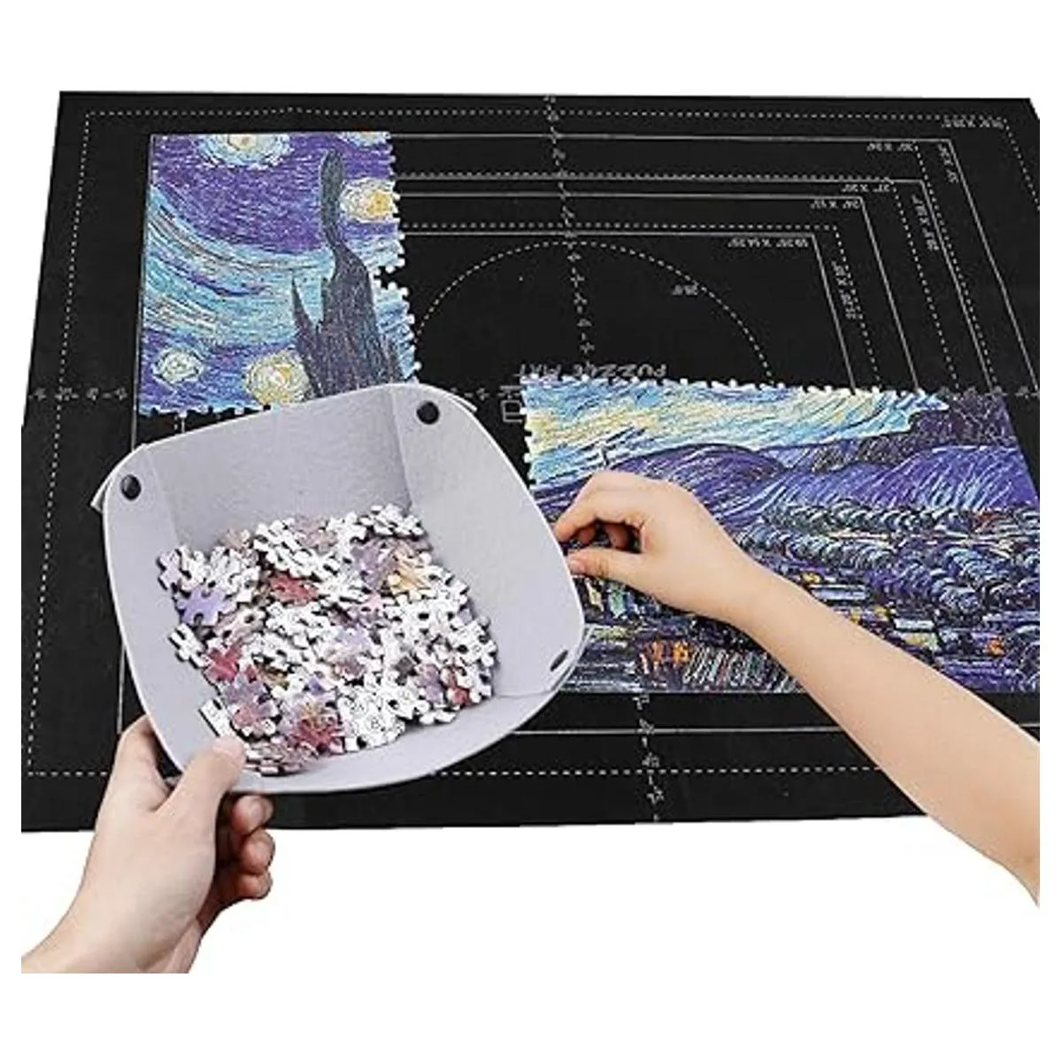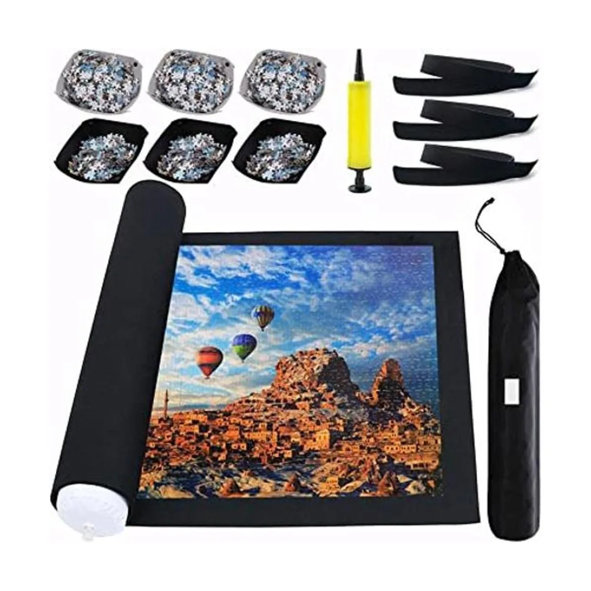 Contenido del paquete: 6 bandejas clasificadoras, 1 alfombrilla de fieltro, 1 tubo inflable, 1 bomba, 3 bandas elásticas, 1 bolsa de almacenamiento. Seis bandejas para una fácil organización mientras comienzas un rompecabezas, evitan que los rompecabezas se caigan.