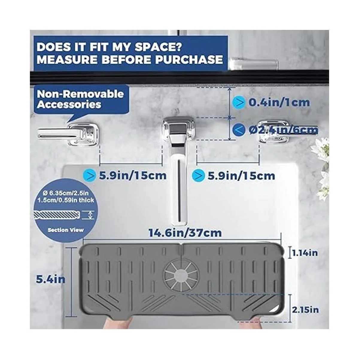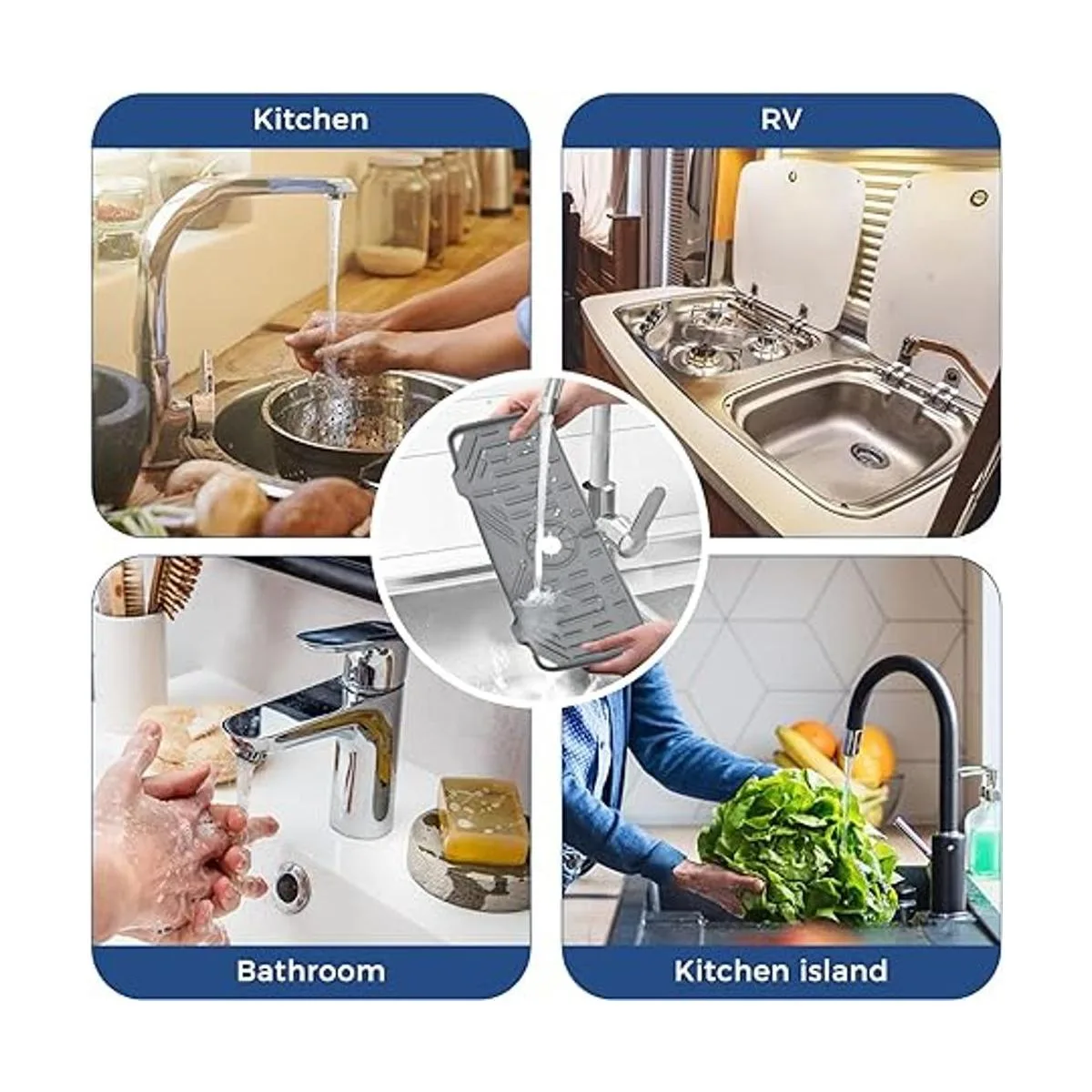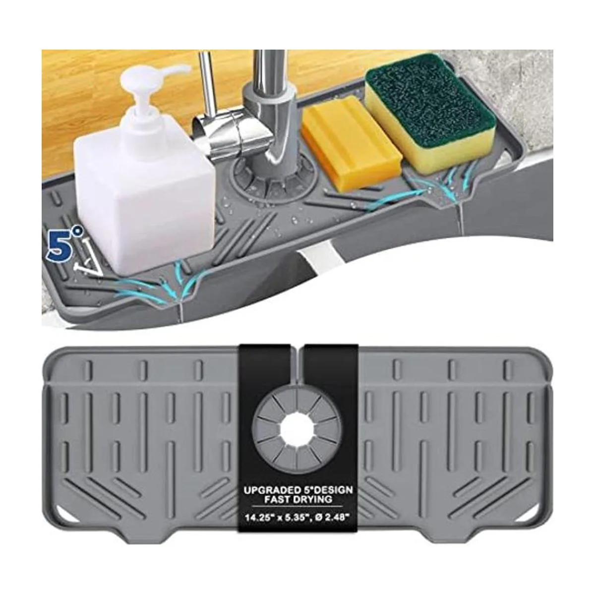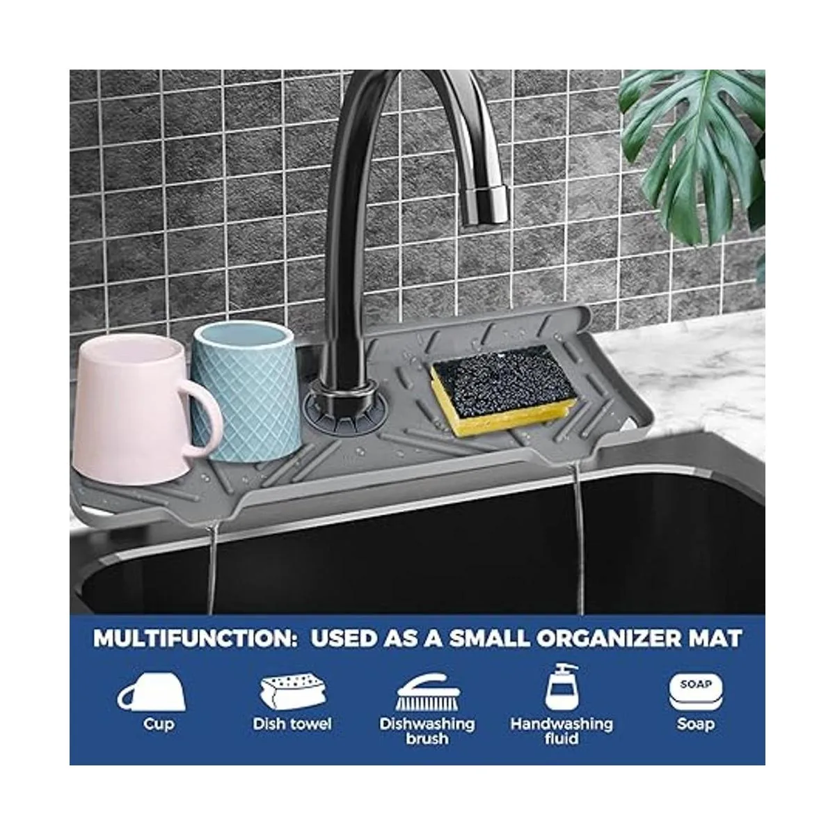 Multifunción: no es solo una alfombrilla de secado de grifo, sino también un soporte de esponja para fregadero de cocina, bandeja de jabón de platos, alfombrilla de secado de platos. Para cocina: pon esponja, jabón de platos, detergente, cepillo y botella en él. Para el baño: pon limpiador facial, maquinilla de afeitar, cepillo de dientes en él. Se utiliza como una pequeña alfombrilla organizadora, almohadilla de drenaje. Es un utensilio de cocina y baño súper práctico.