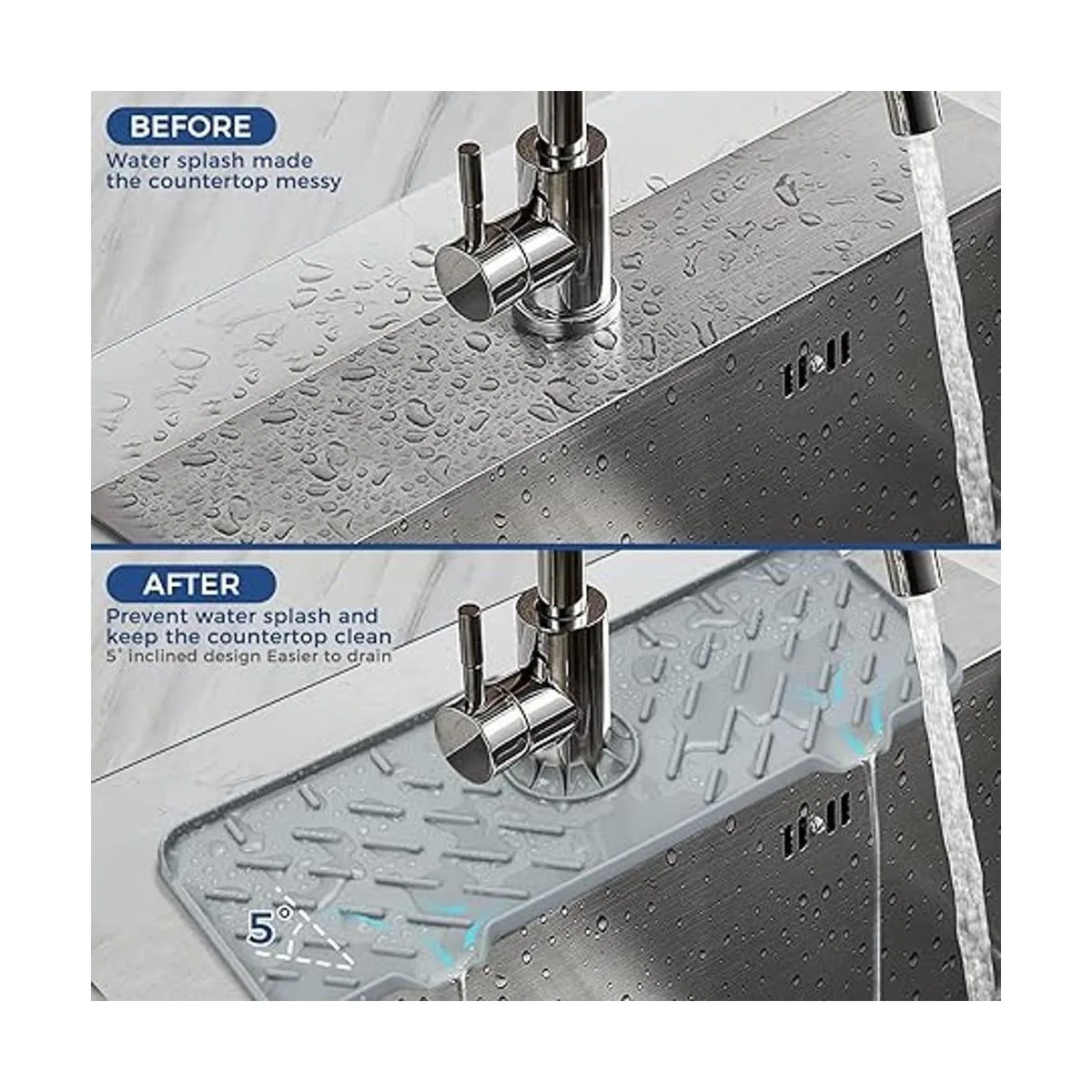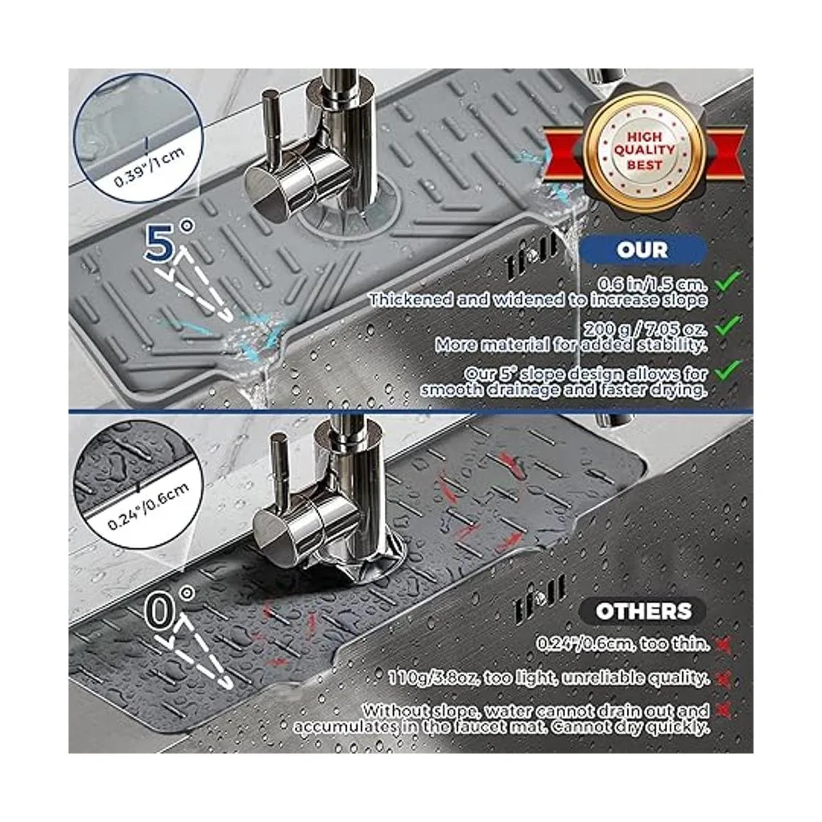 Versión mejorada Mientras que otros protectores contra salpicaduras de fregadero de grifo de cocina están hechos de tela difícil de limpiar que tarda mucho tiempo en secarse, nuestro recogedor de agua de silicona para fregadero está hecho de 100 silicona, suave y fiable, reutilizable y duradero, no raya tus utensilios, totalmente seguro de usar. Nuestros recogedores de agua de silicona atraparán el agua y el agua se drenará a tu fregadero, así que no te preocupes por la alfombrilla de tela húmeda, o lava la alfombrilla y sécala.