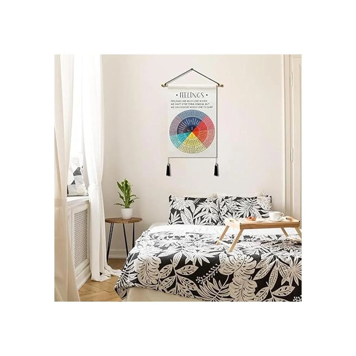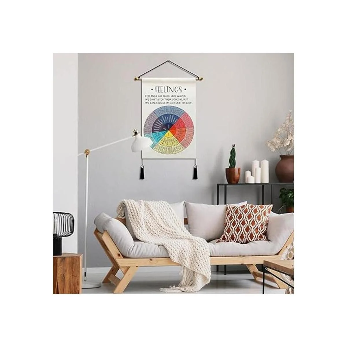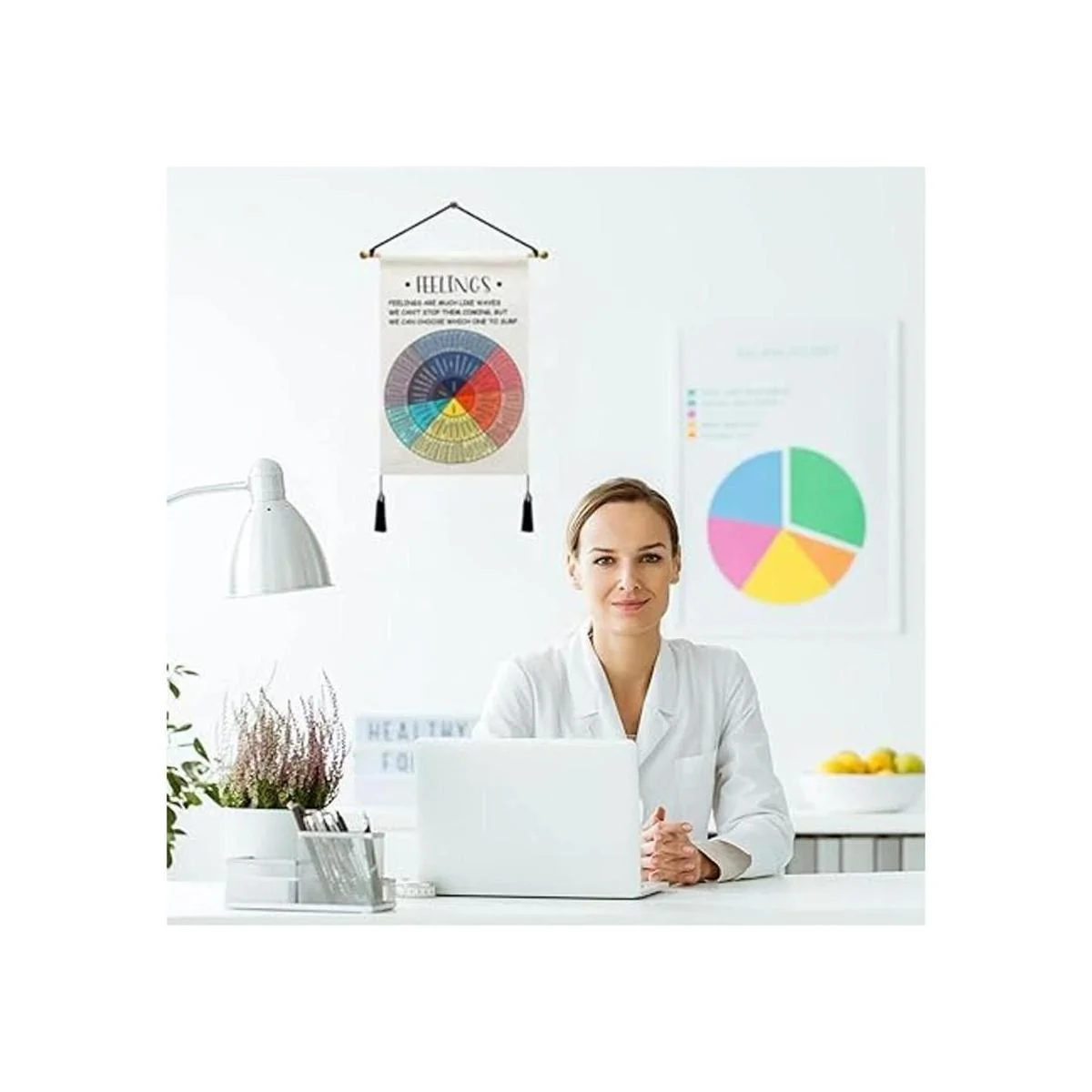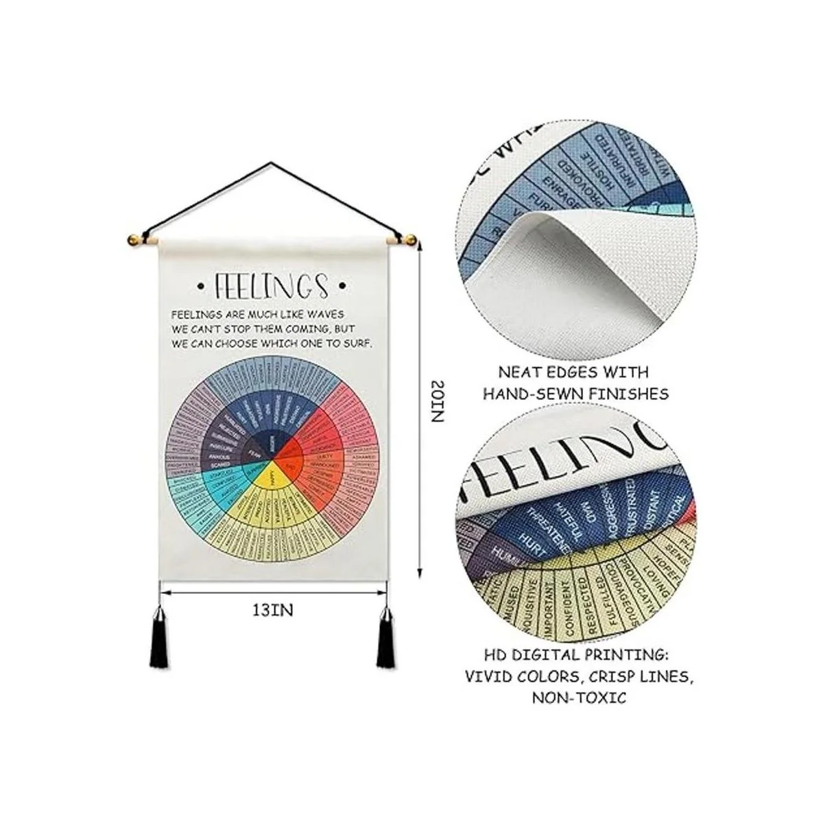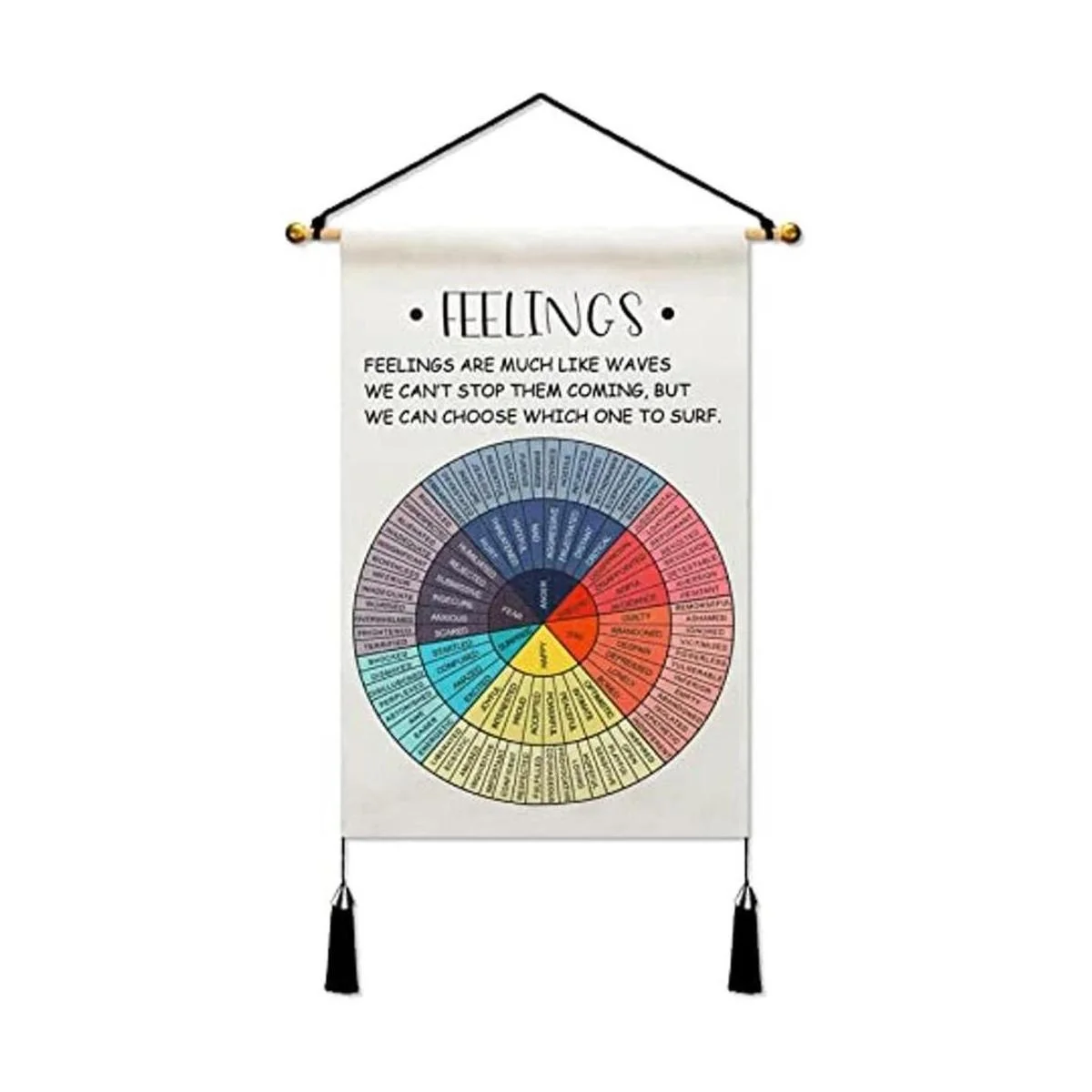 Tapiz de salud mental, tabla de sentimientos pequeños, terapia, decoración de oficina, aprendizaje social, emocional, arte de pared, tabla de comportamiento de los niños, para la escuela, aula, oficina de asesoramiento, 20 x 13 pulgadas rueda de sentimientos