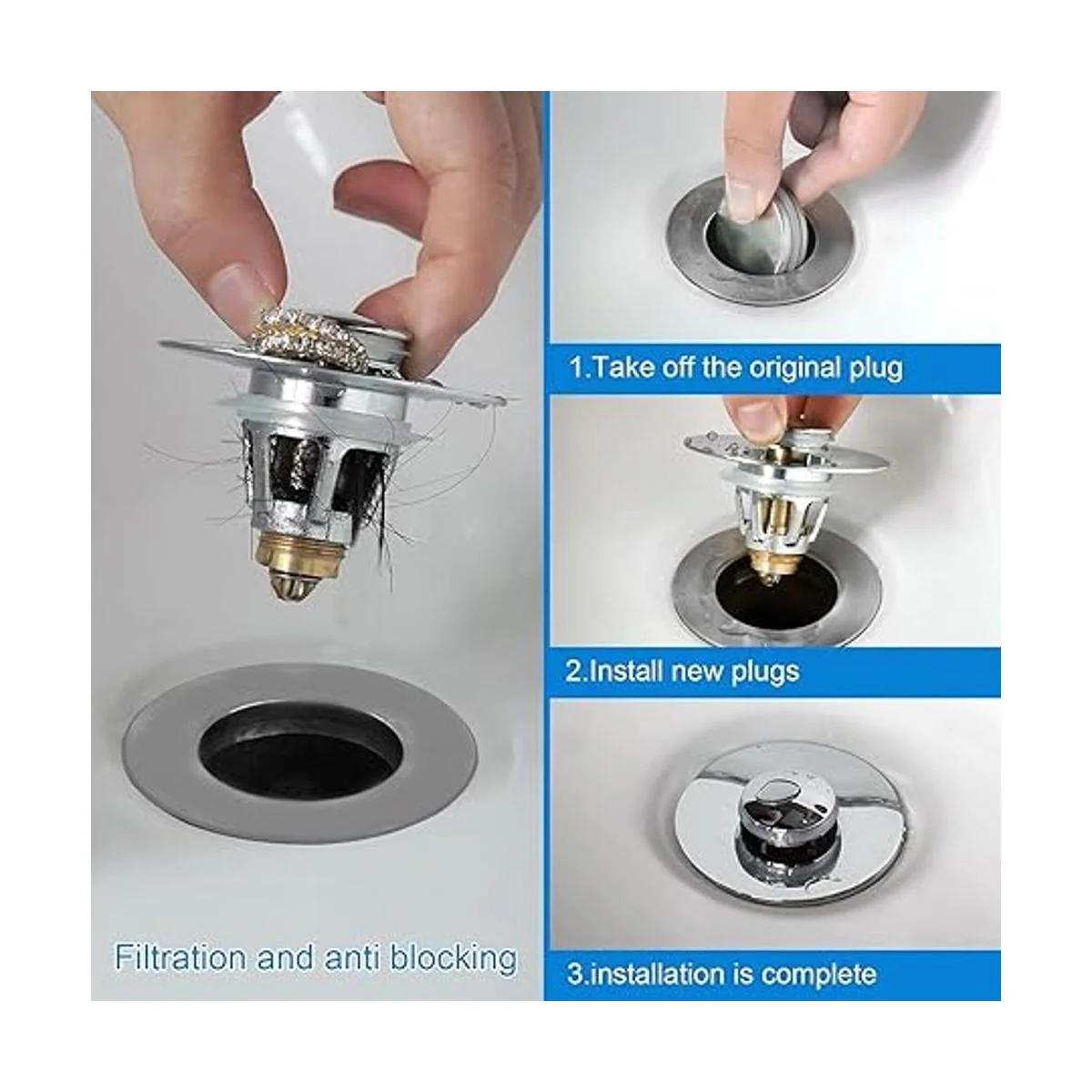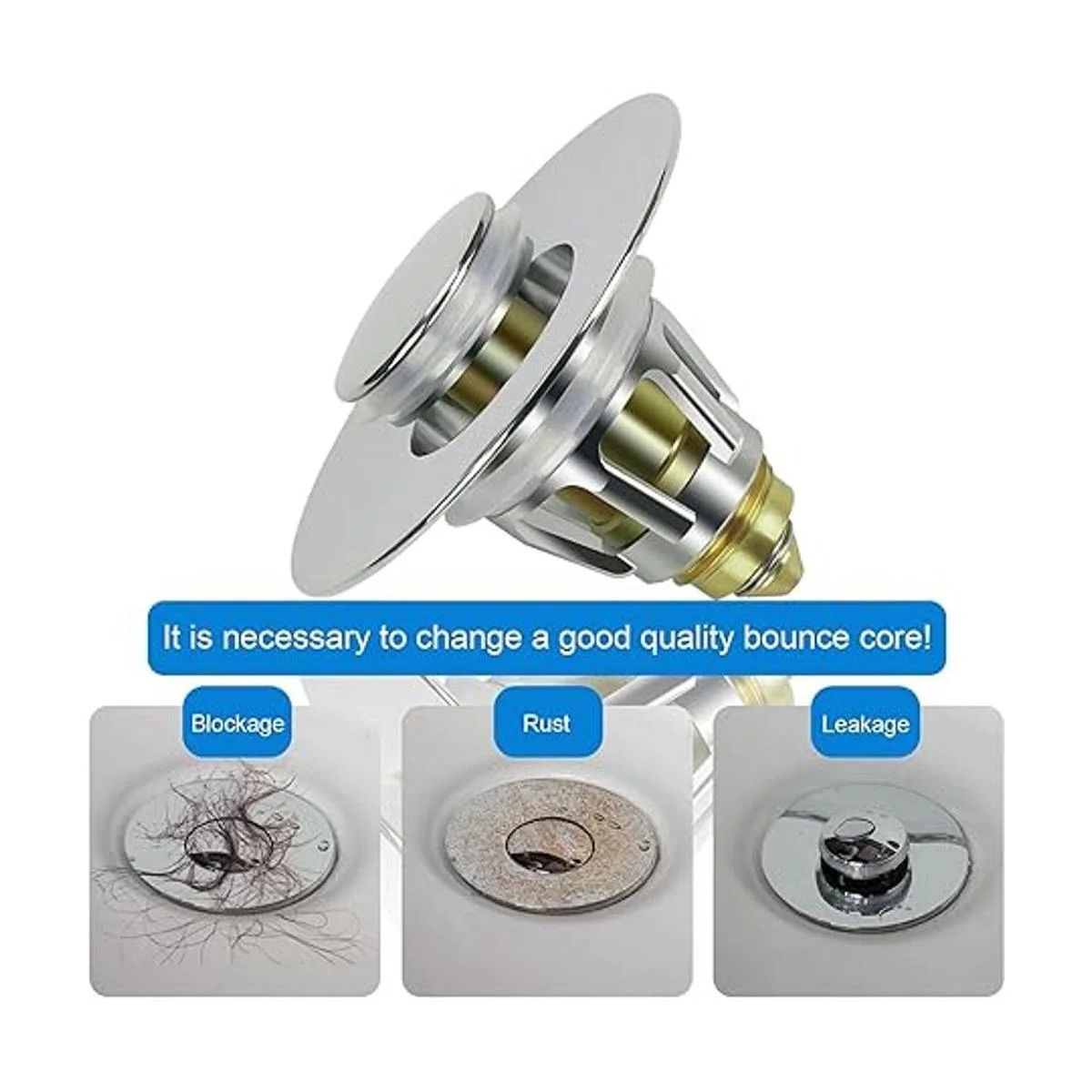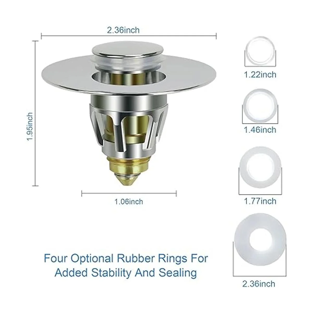 Filtro integrado: a diferencia del drenaje regular con botón, este desage de fregadero tiene un colador de cesta antiobstrucción en el interior que recoge perfectamente los pelos y evita que el drenaje se obstruya, cosas que no entrarán en el desage, como joyas, anillo, suciedad, etc.