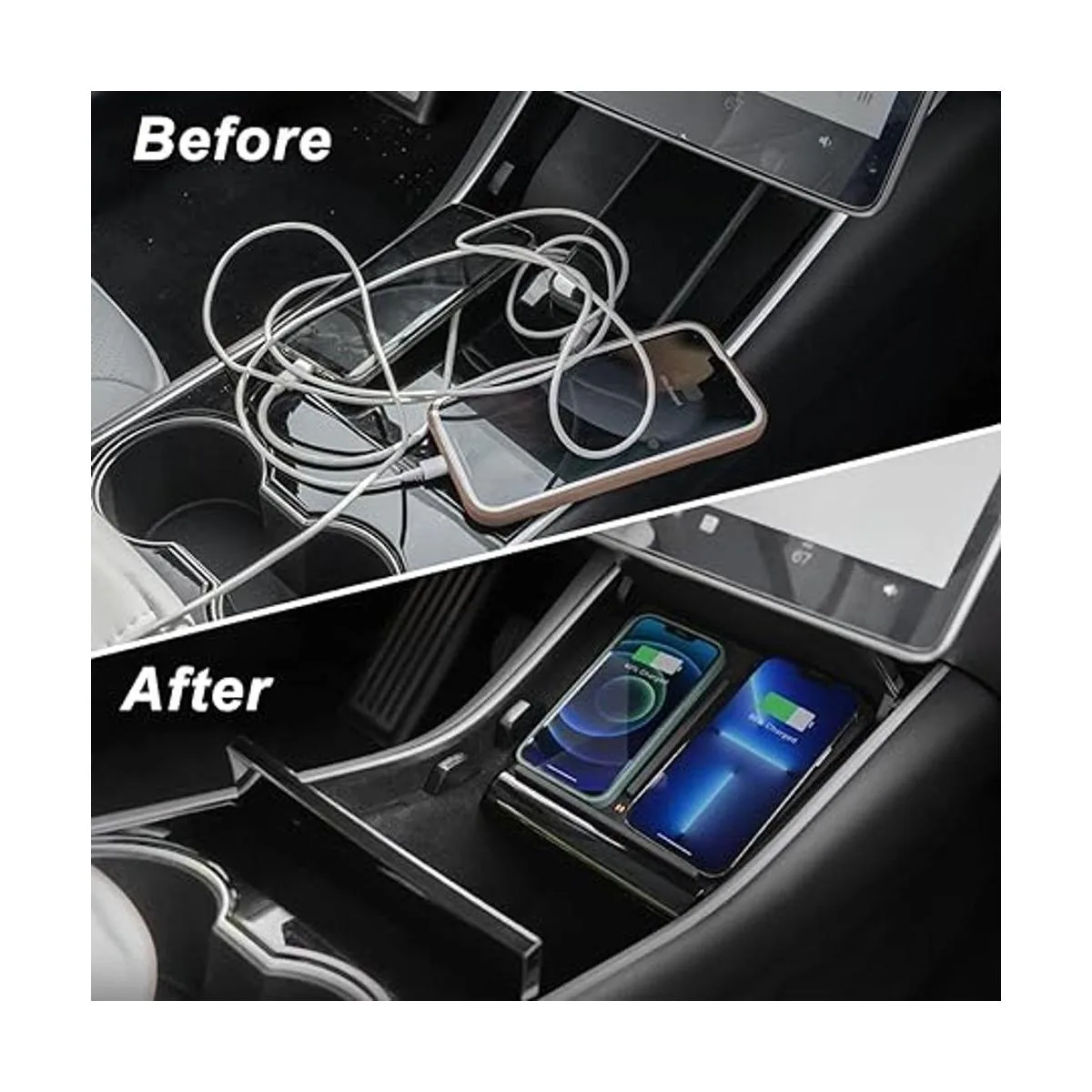 TAPTES Cargador inalámbrico para Tesla Modelo 3 2017 2018 2019 2020, almohadilla de carga dual para accesorios Tesla Model 3, interior de la consola central del automóvil, compatible con teléfonos inteligentes iPhone y Samsung, color negro