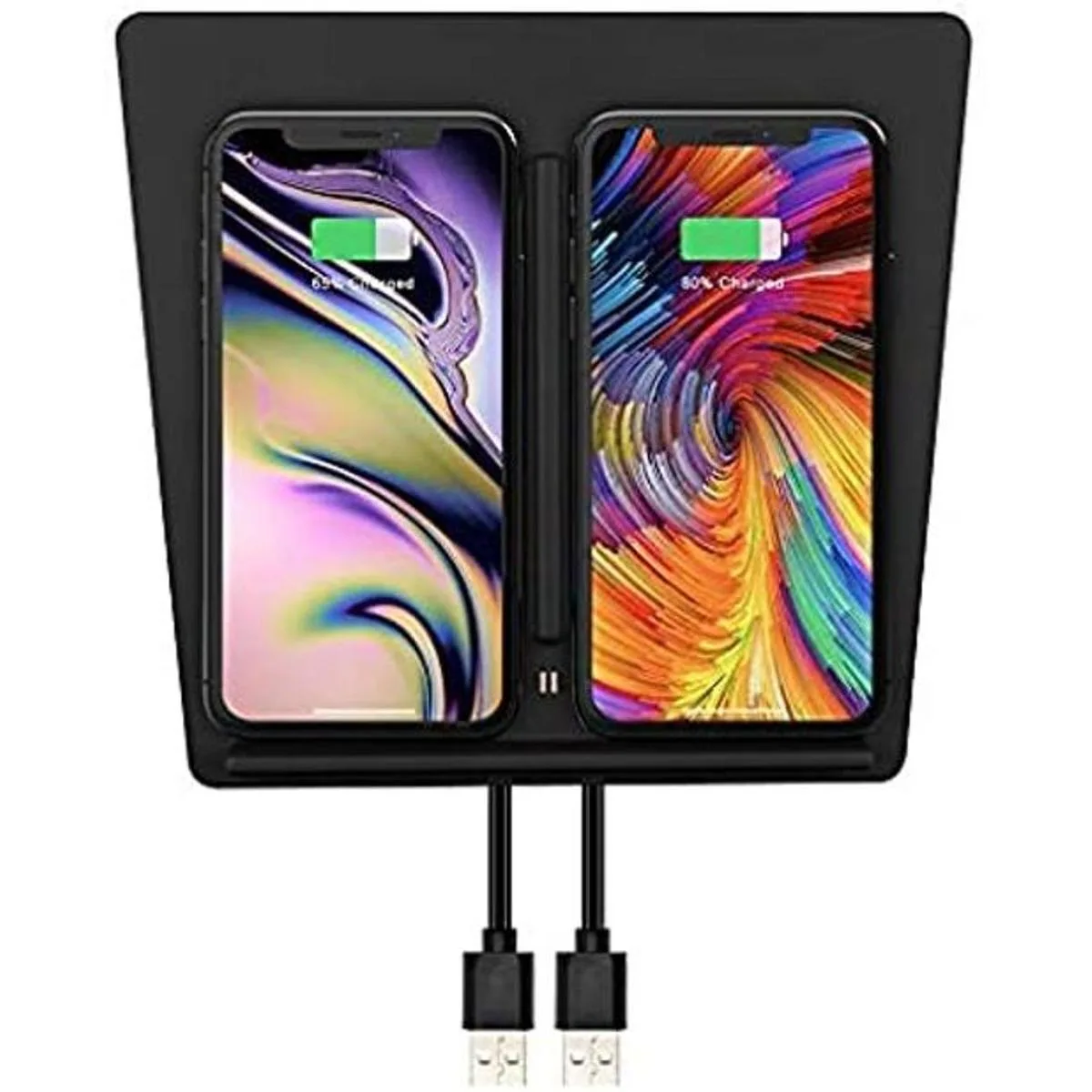Puertos USB dobles para carga inalámbrica de 2 teléfonos inteligentes habilitados: Compatible con ambos lados o un lado izquierdo o derecho, carga solo 1 teléfono mediante 1 entrada USB, carga 2 teléfonos simultáneamente mediante 2 entradas USB. Compatible con cualquier dispositivo como iPhone XS/XR/X/8/8 Plus y otros teléfonos.