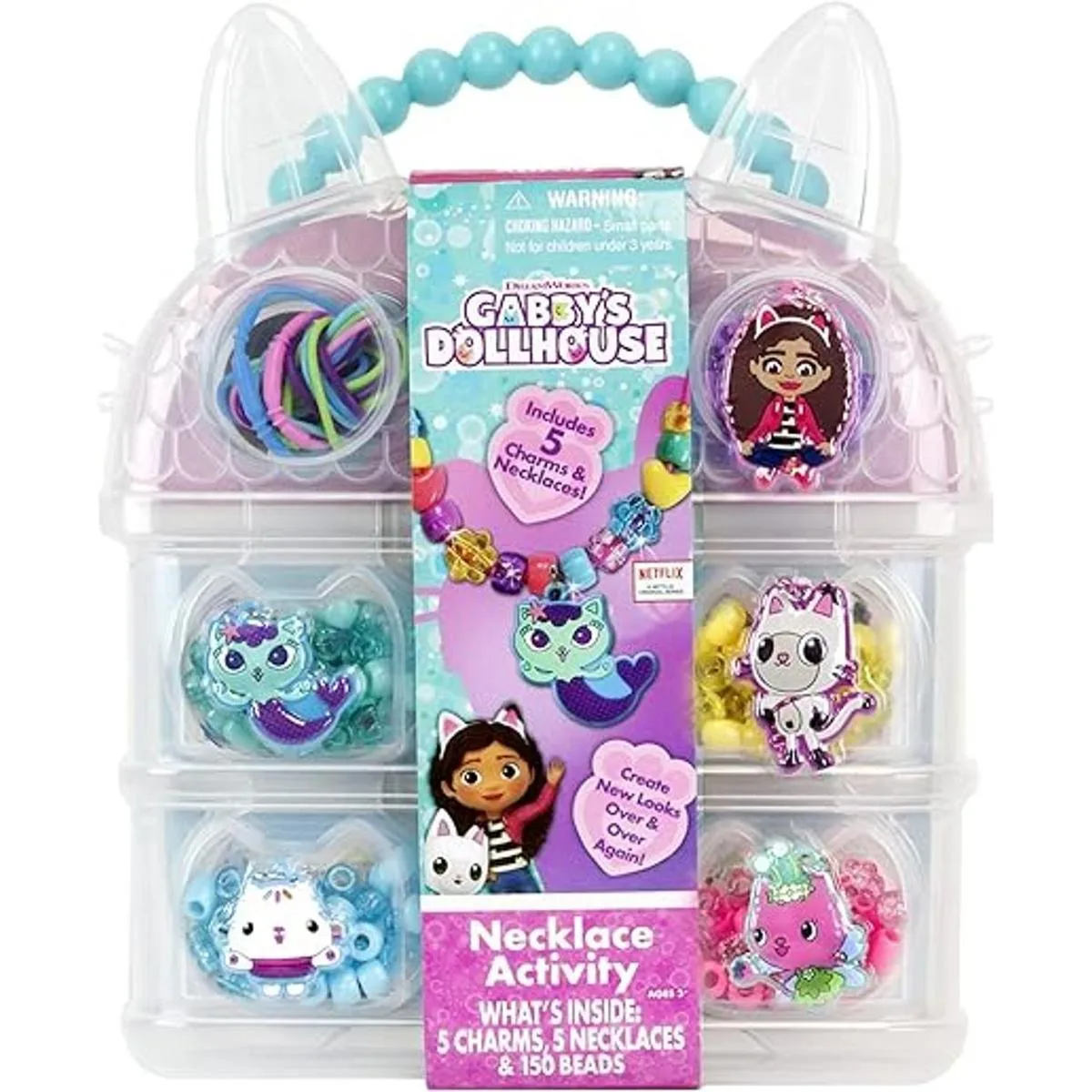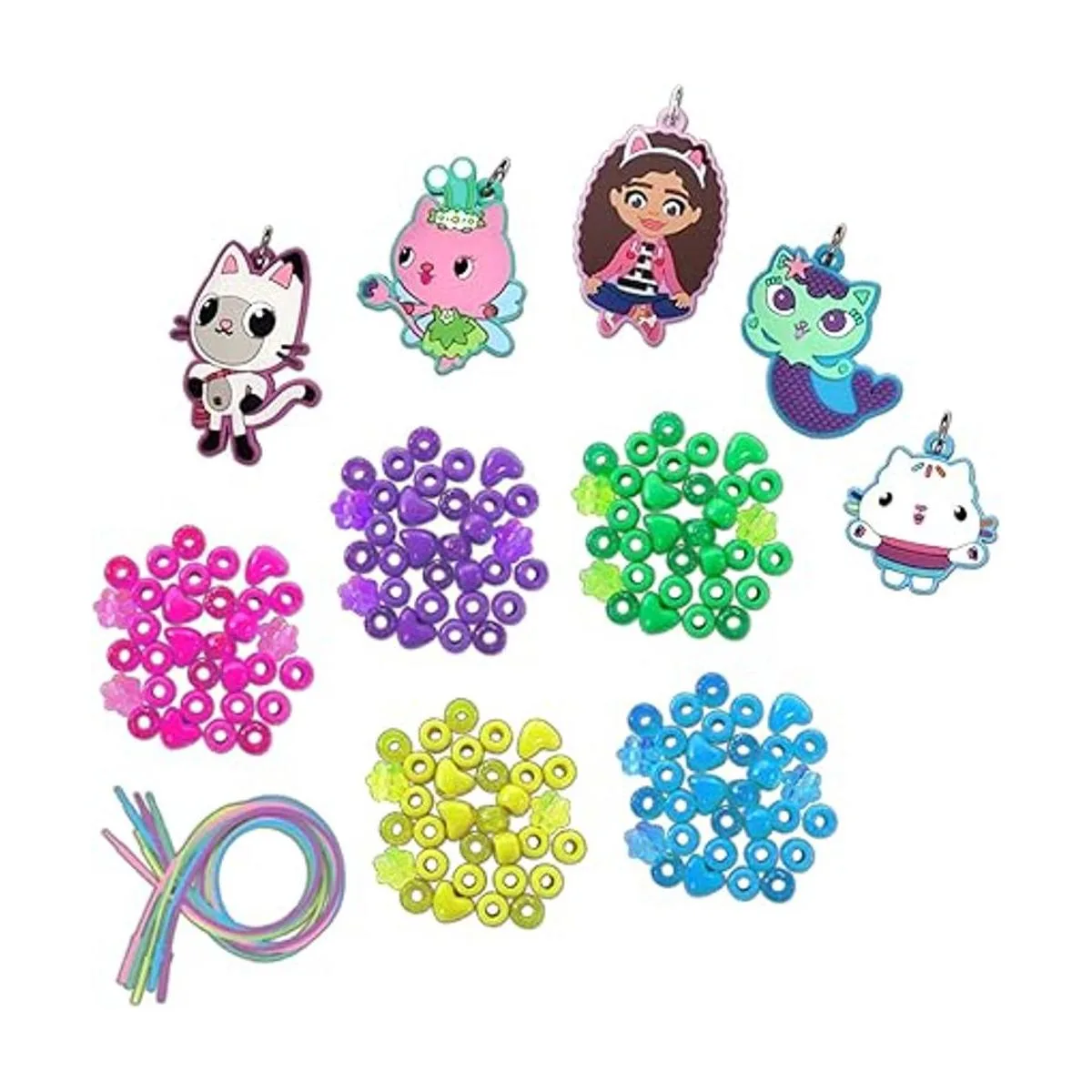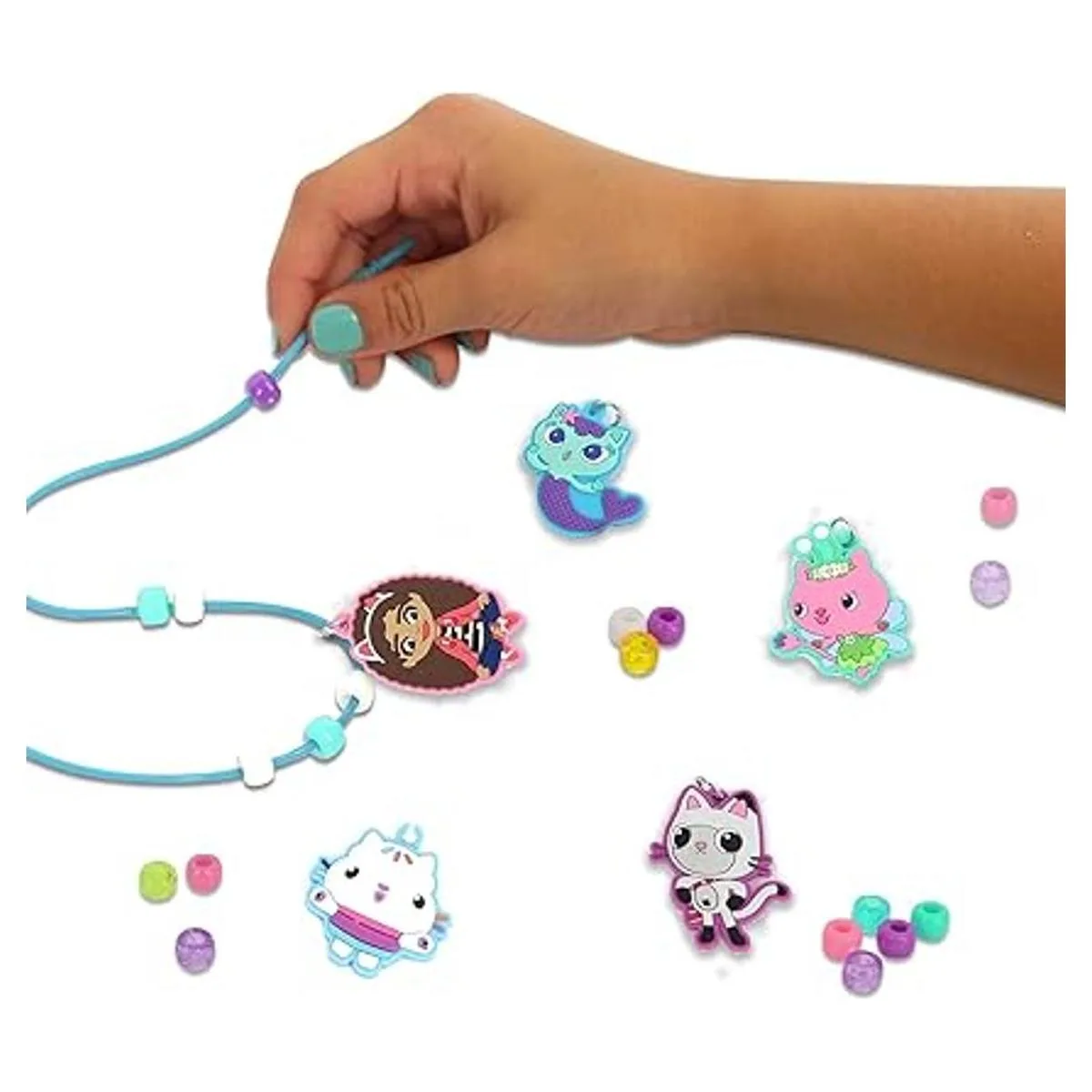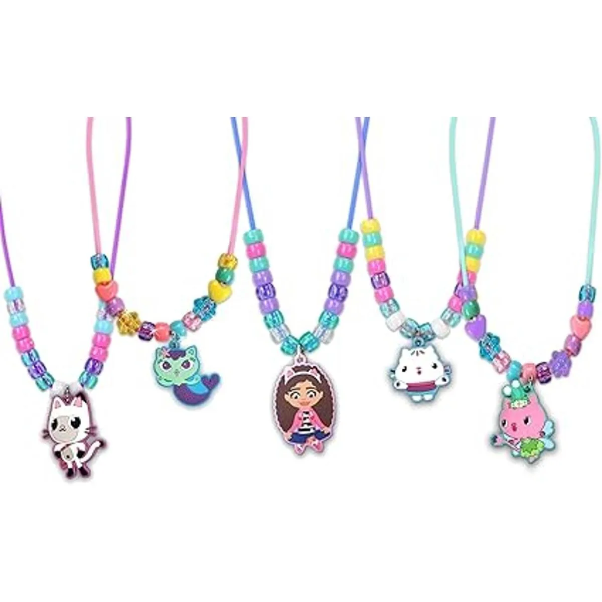 Mezcla y combina para crear tus propias joyas de casa de muñecas de Gabby con cuentas coloridas y dijes de personajes en un cordón de collar.