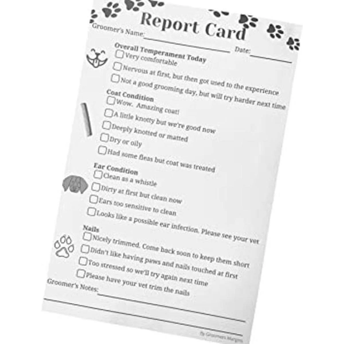 Cada bloc de 100 páginas para informes de peluquería de perros aborda el temperamento, la calidad del pelaje, la limpieza de las orejas y las uñas