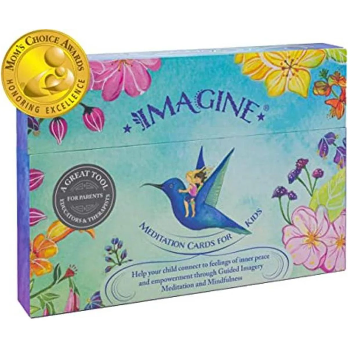 El kit de meditación Imagine para niños ofrece 24 grandes guiones de atención plena para niños con guiones ricas en contenido e ilustraciones vibrantes de meditaciones de imágenes guiadas para niños, un ejercicio de respiración de atención plena para practicar antes de cualquier meditación, y 2 tarjetas de bricolaje para que tu hijo cree sus propias tarjetas.