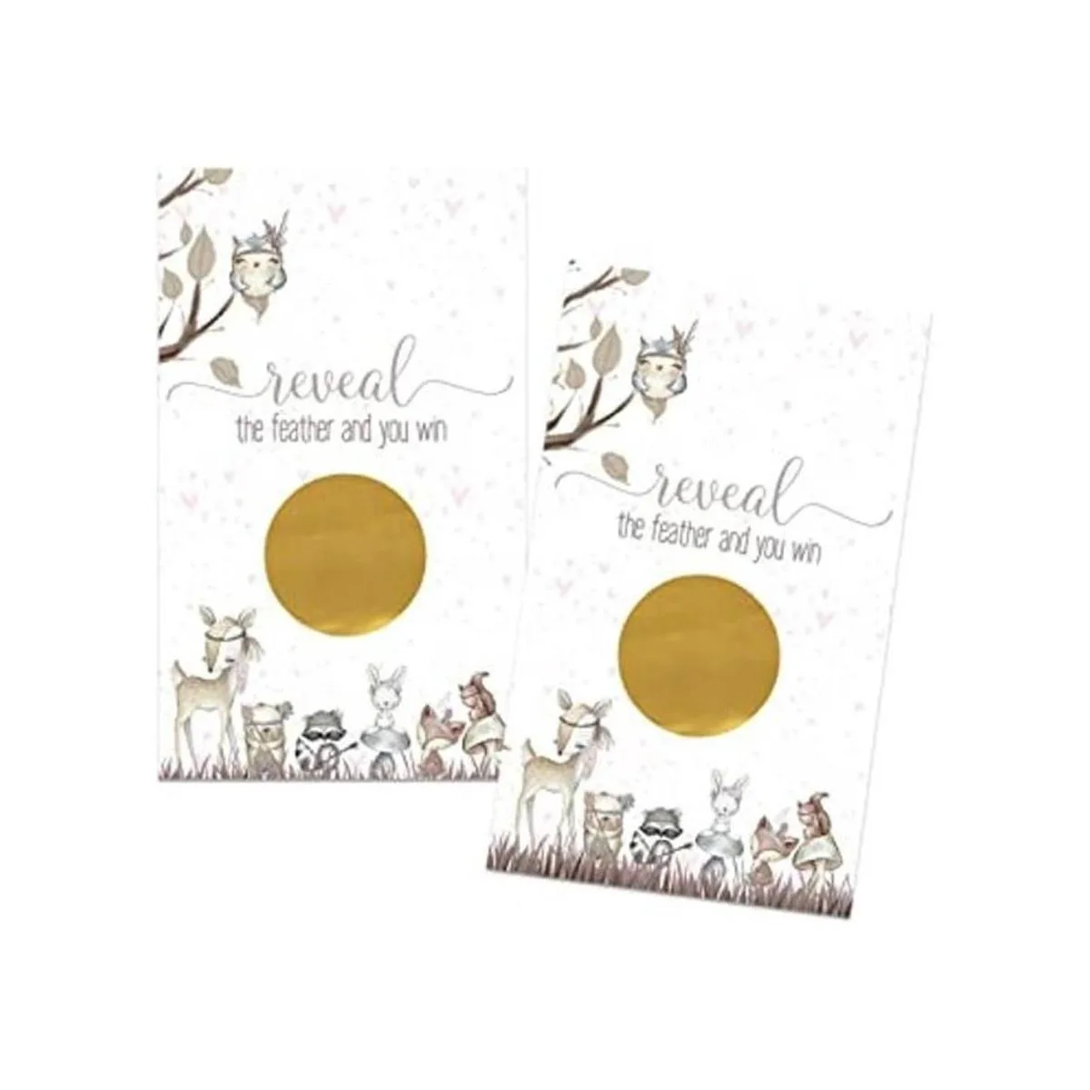 Juegos para baby shower de Woodland Friends: celebra al bebé con nuestras divertidas tarjetas para rascar con estilo en colores rosa y el diseño de animales del bosque para niñas.