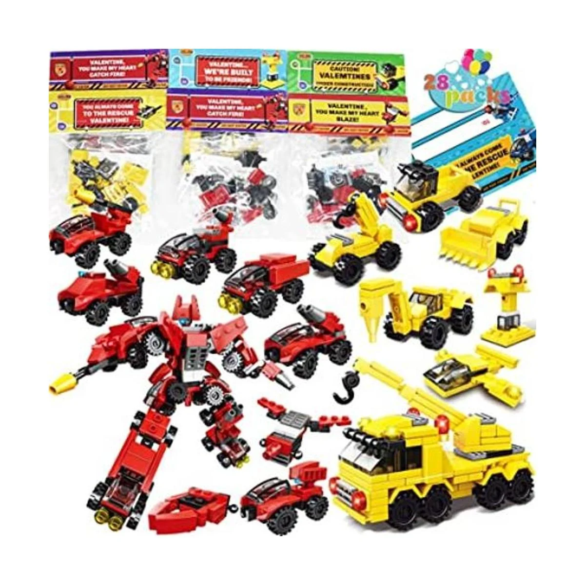 Tarjetas del día de San Valentín con bloques de construcción de robots de vehículos de la ciudad, 28 paquetes de juguetes de robots de San Valentín, tarjetas de felicitación de San Valentín, regalos de intercambio para el aula escolar de los niños