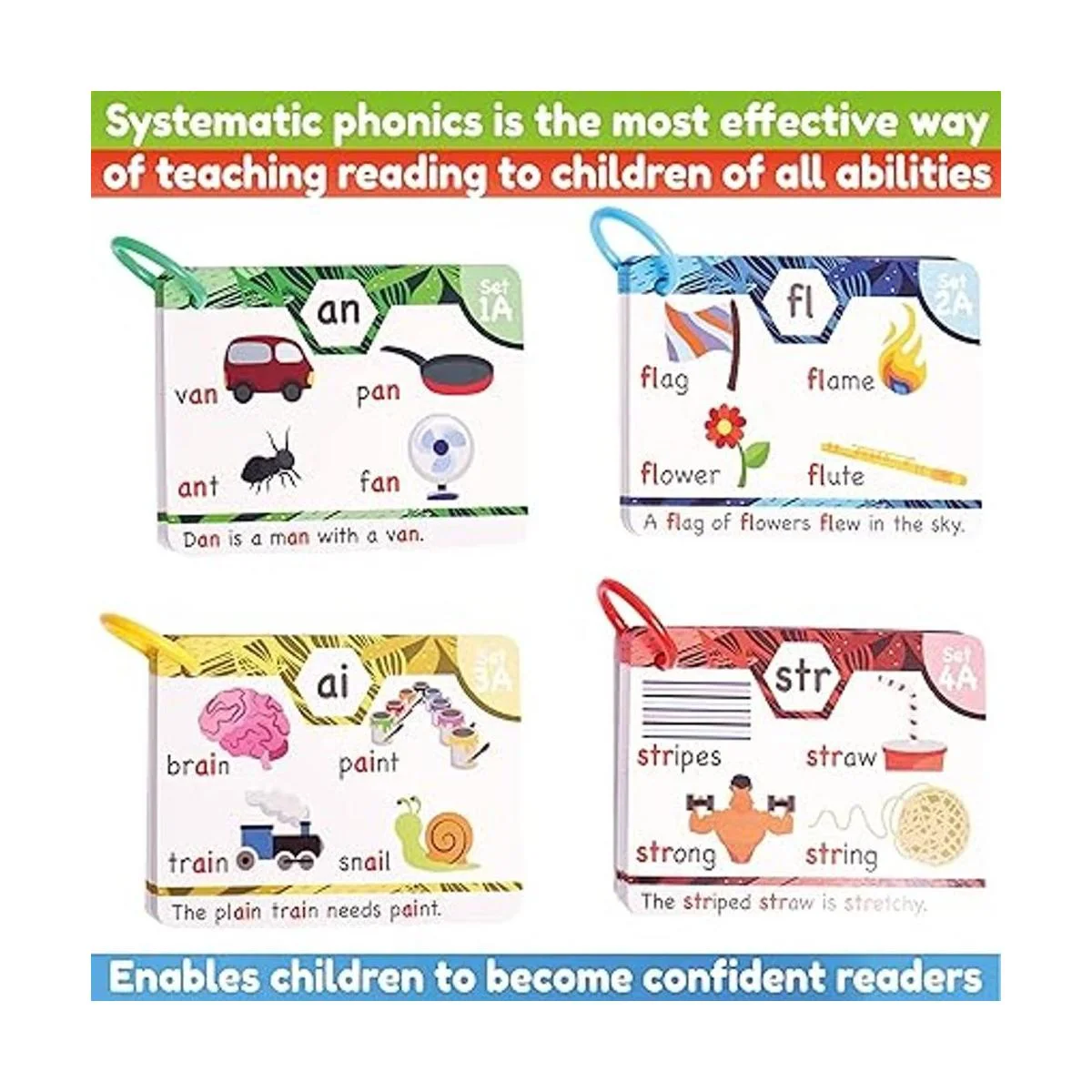 Domina su fonética, suena palabras y mejora enormemente sus habilidades de lectura: 62 tarjetas flash; 4 anillos de clasificación; 480 palabras e imágenes; 120 frases; 4 niveles de dificultad 20 grupos familiares de fonogramas