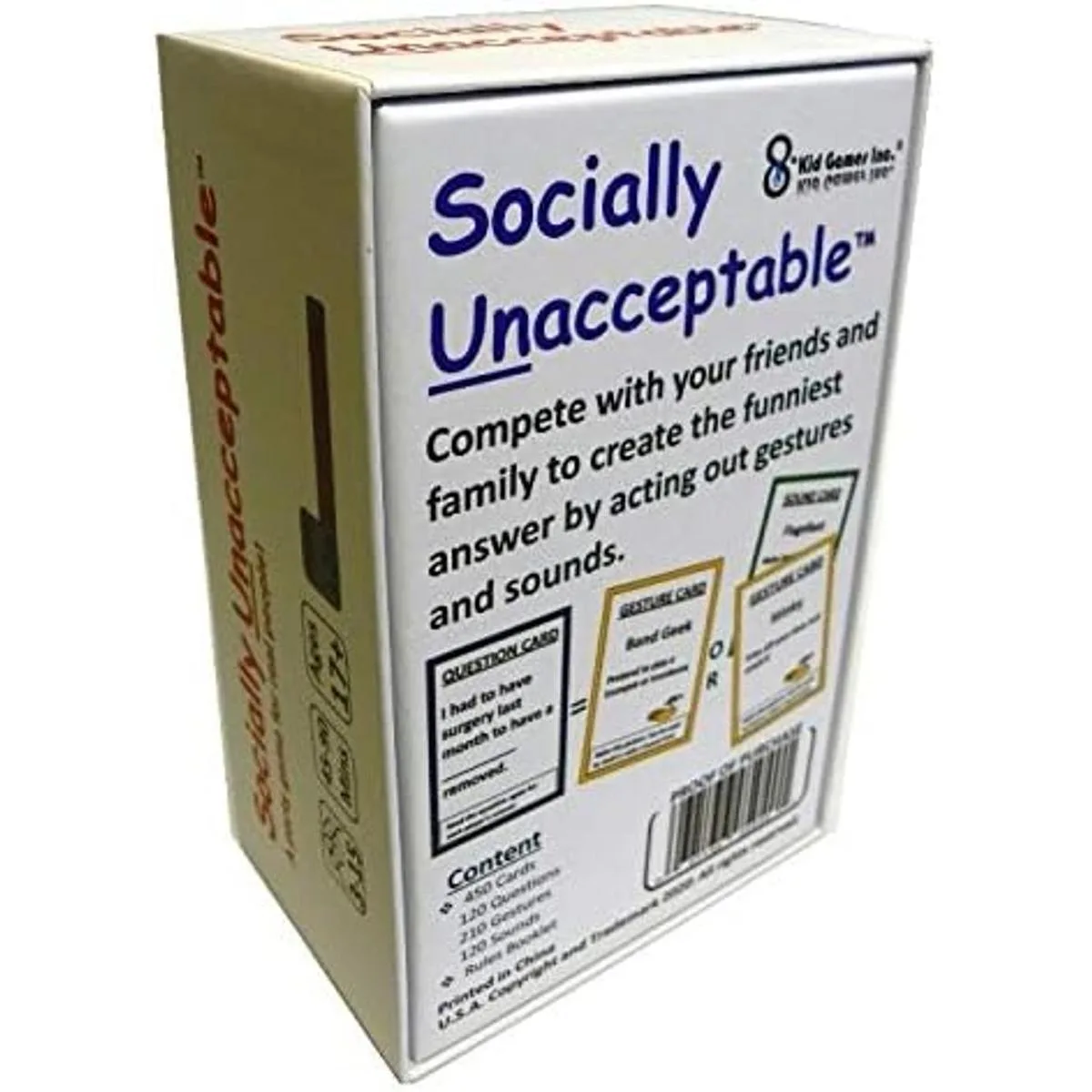 Qué hay dentro Socialmente inaceptable contiene 450 tarjetas. 120 tarjetas de pregunta, 210 tarjetas de gesto, 120 tarjetas de sonido impresas en cartulina de juego premium. Incluye folleto de reglas fácil de seguir y aprender.