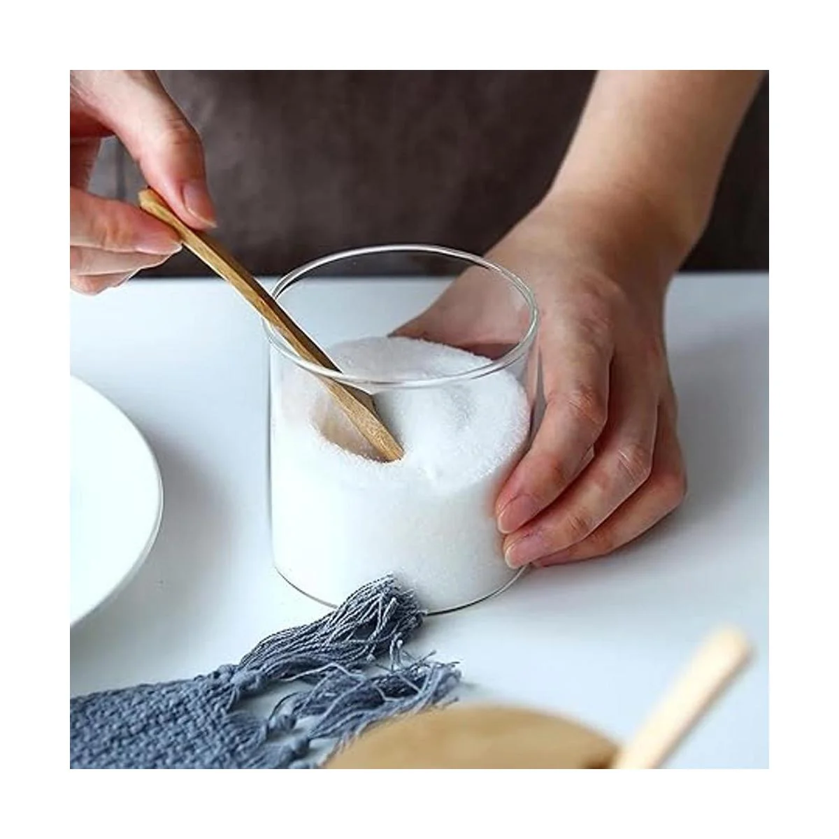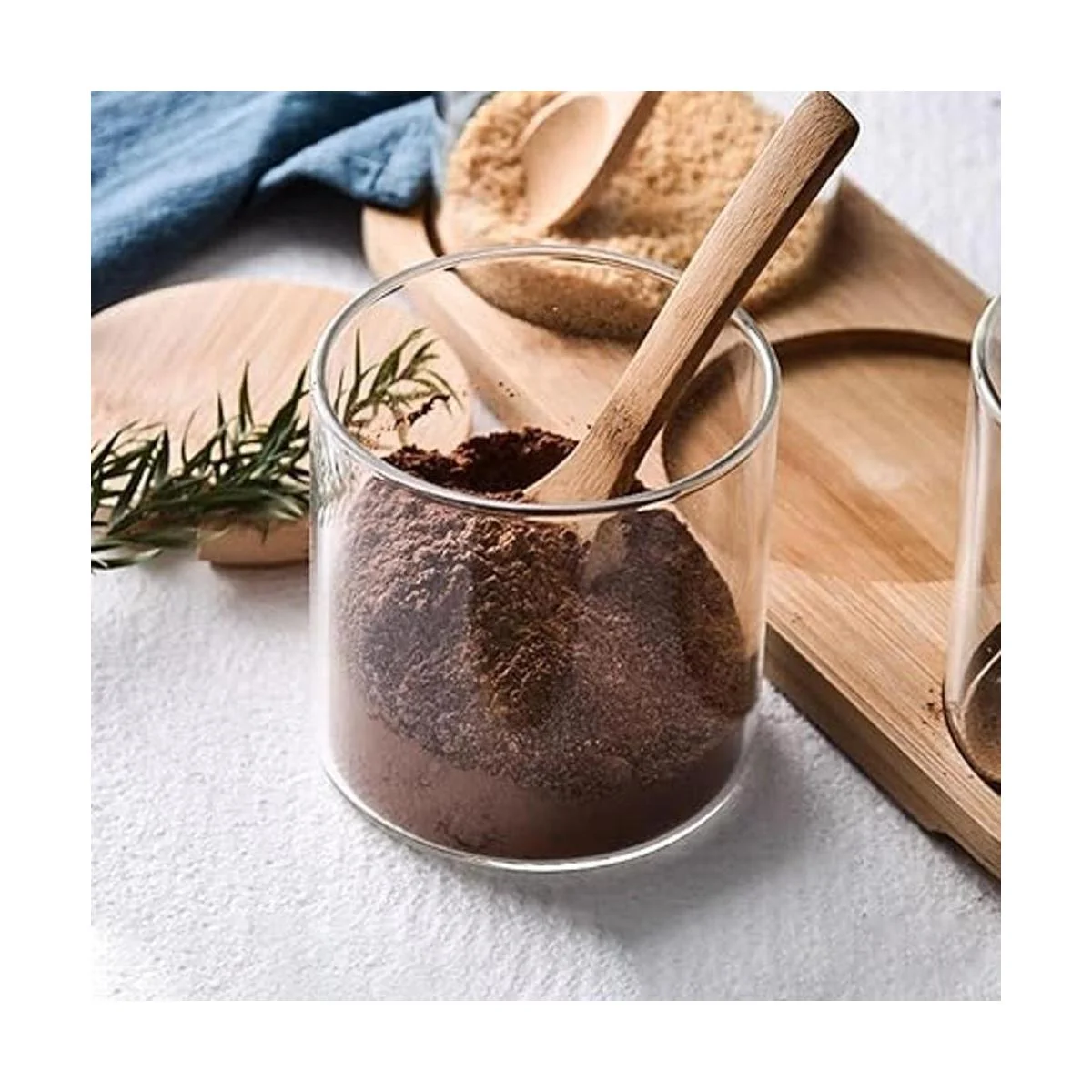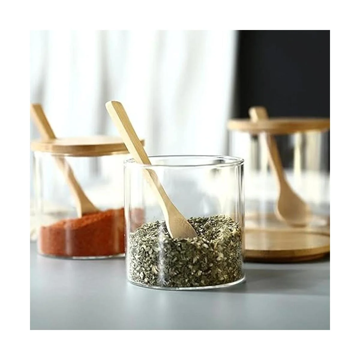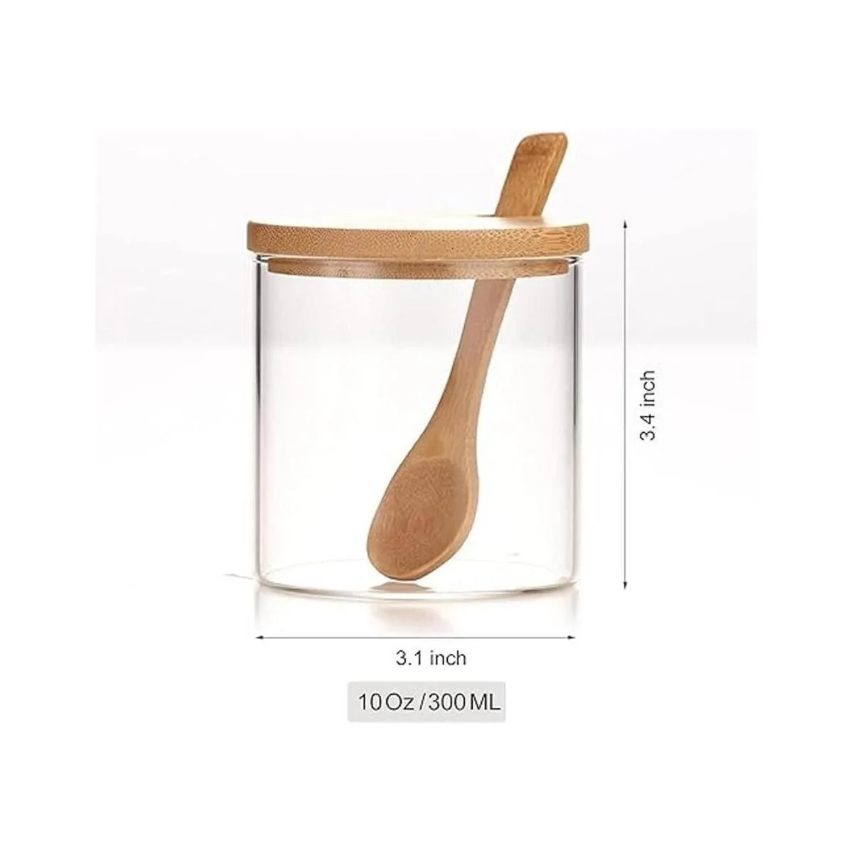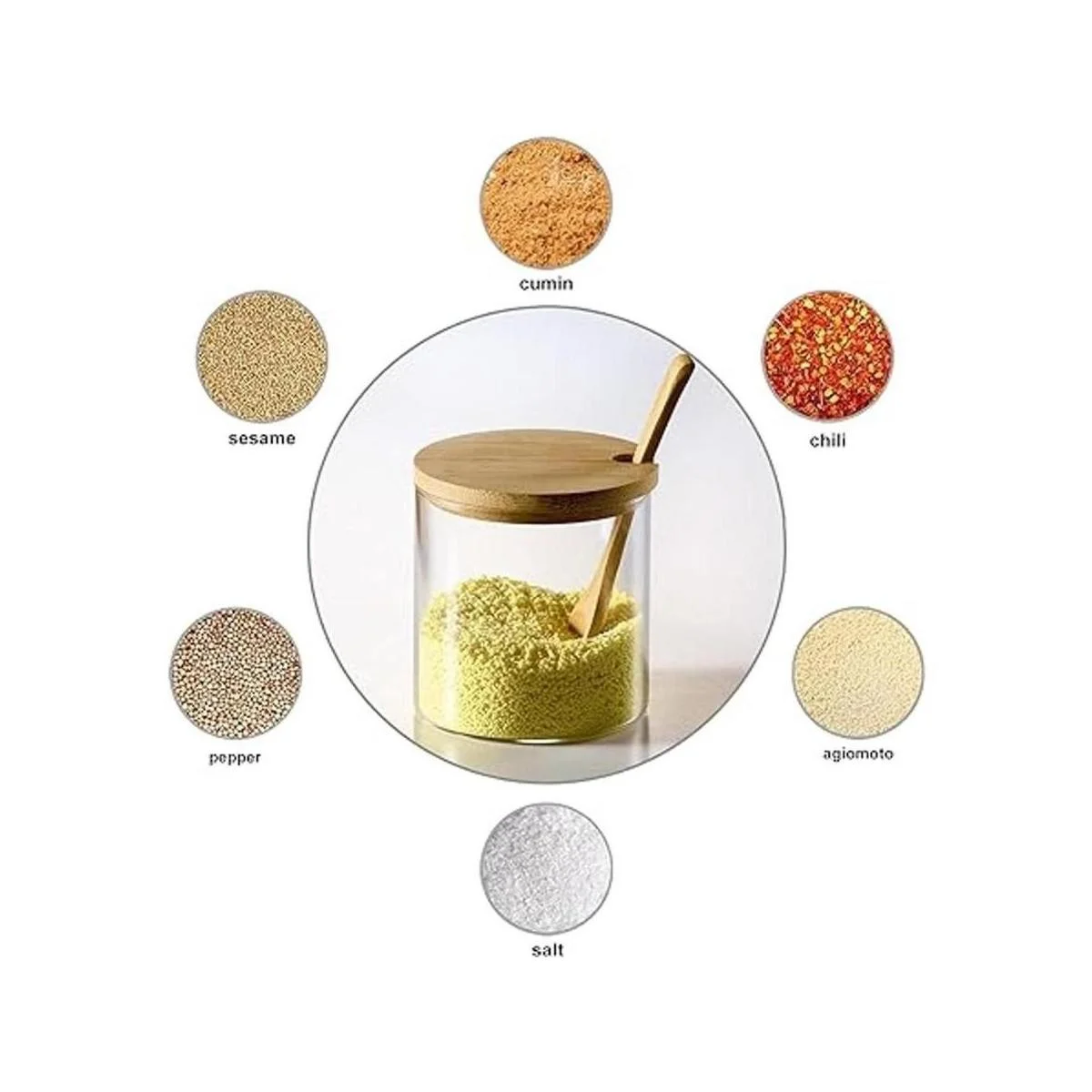 Tarro de vidrio transparente de 10.1 fl oz con tapa de bambú y cuchara de madera, lindo recipiente de almacenamiento de sal, recipiente de condimento con cuchara para especias, pimienta para cocina, mesa, encimera