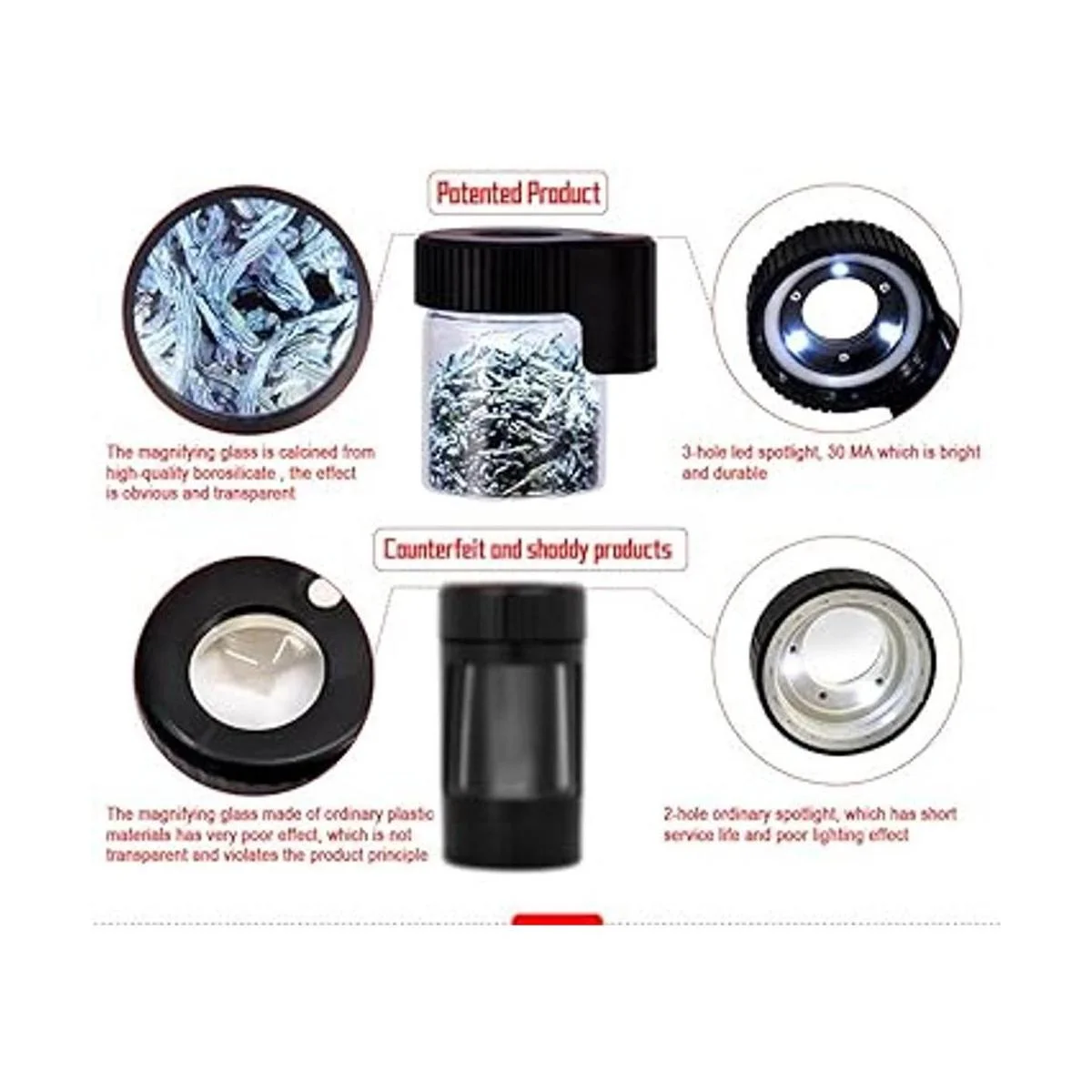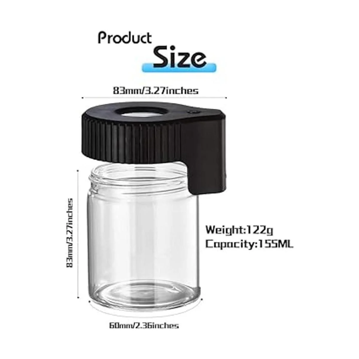 Dimensiones del producto Nuestro tarro de lupa con luz LED, capacidad: 5.2 fl oz, diámetro: 2.559 in, altura: 3.268 in, tamaño grande. Ya sea especias, café, pastillas, manualidades de pasatiempos o cualquier otra cosa, acabas de encontrar el tarro hermético a prueba de derrames siempre hace el trabajo.